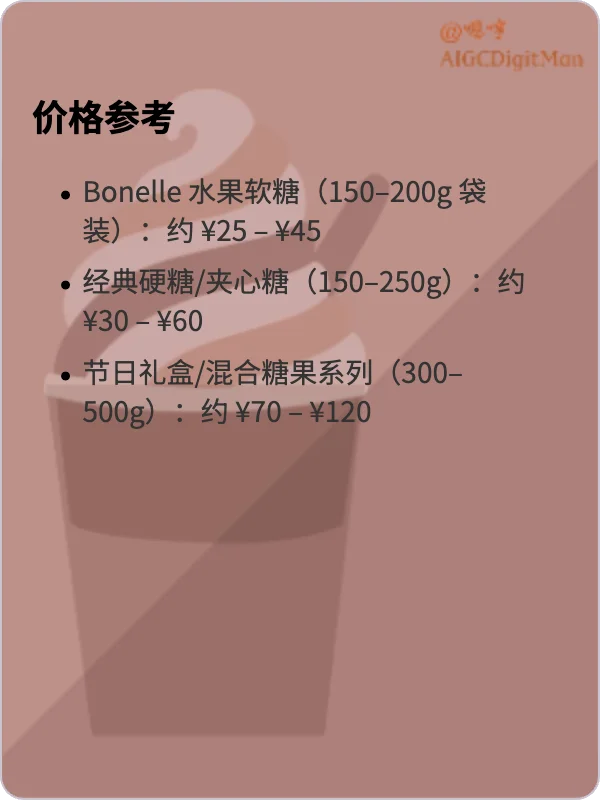 节日礼盒/混合糖果系列(300–500g):约 ¥70 – ¥120