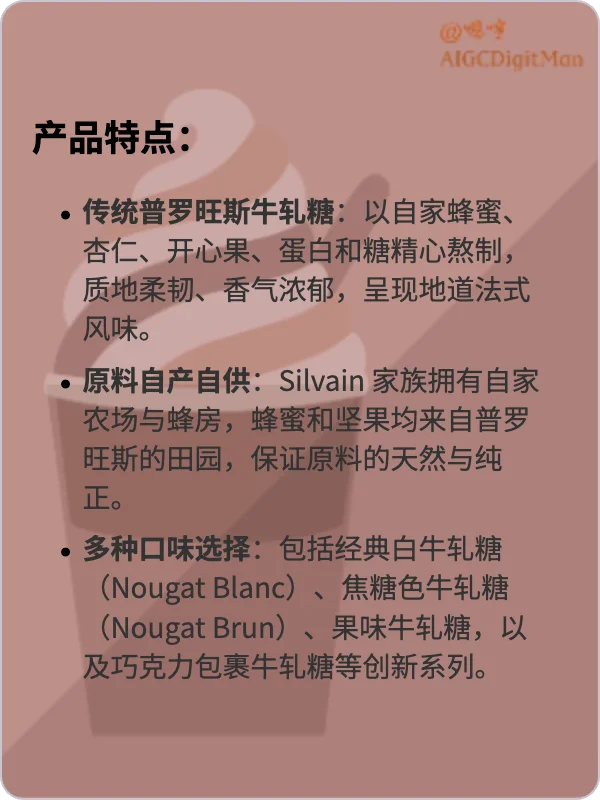 多种口味选择:包括经典白牛轧糖(Nougat Blanc)、焦糖色牛轧糖(Nougat Brun)、果味牛轧糖,以及巧克力包裹牛轧糖等创新系列。