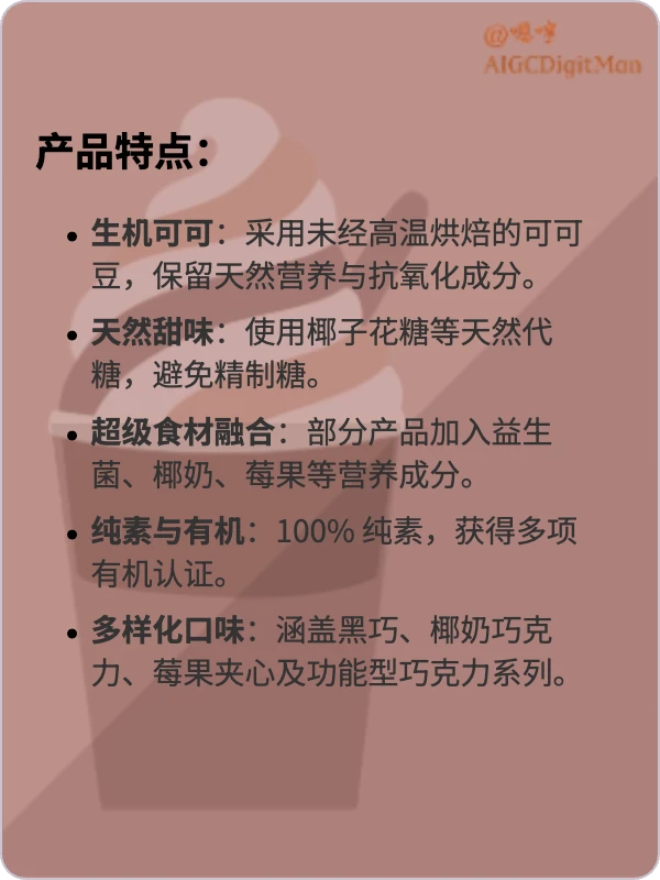 生机可可:采用未经高温烘焙的可可豆,保留天然营养与抗氧化成分。