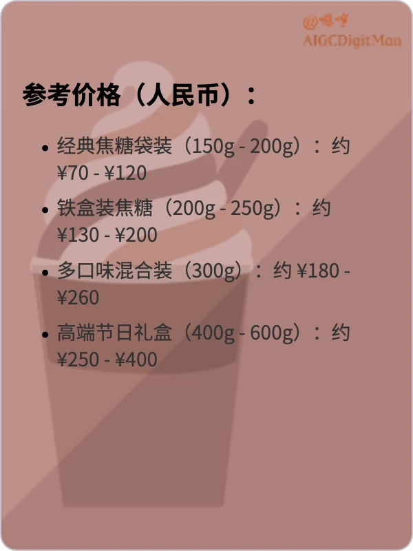 经典焦糖袋装(150g - 200g):约 ¥70 - ¥120