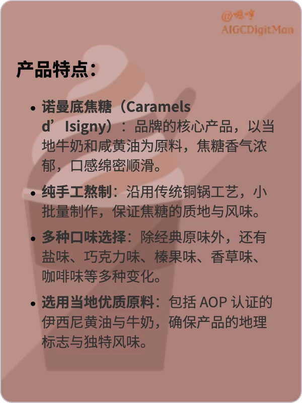 品牌以其深厚的法式甜点与糖果传统著称,尤其擅长利用诺曼底盛产的高品质奶油与牛奶,制作出风味浓郁、口感细腻的焦糖与糖果。