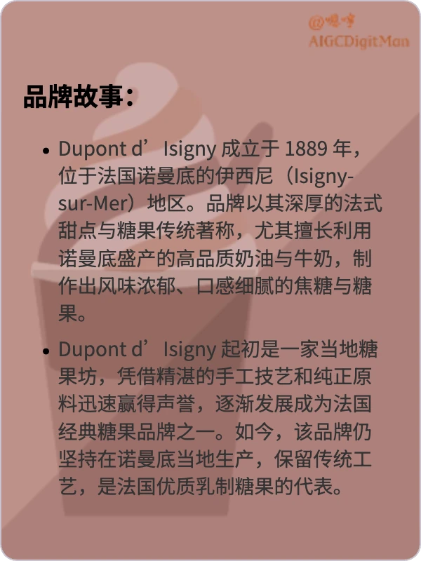 Dupont d’Isigny 起初是一家当地糖果坊,凭借精湛的手工技艺和纯正原料迅速赢得声誉,逐渐发展成为法国经典糖果品牌之一。