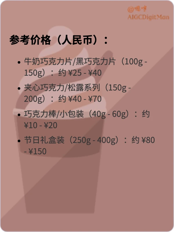 巧克力棒/小包装(40g - 60g):约 ¥10 - ¥20