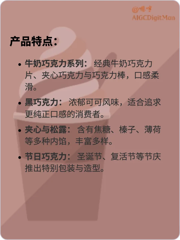 黑巧克力: 浓郁可可风味,适合追求更纯正口感的消费者。
