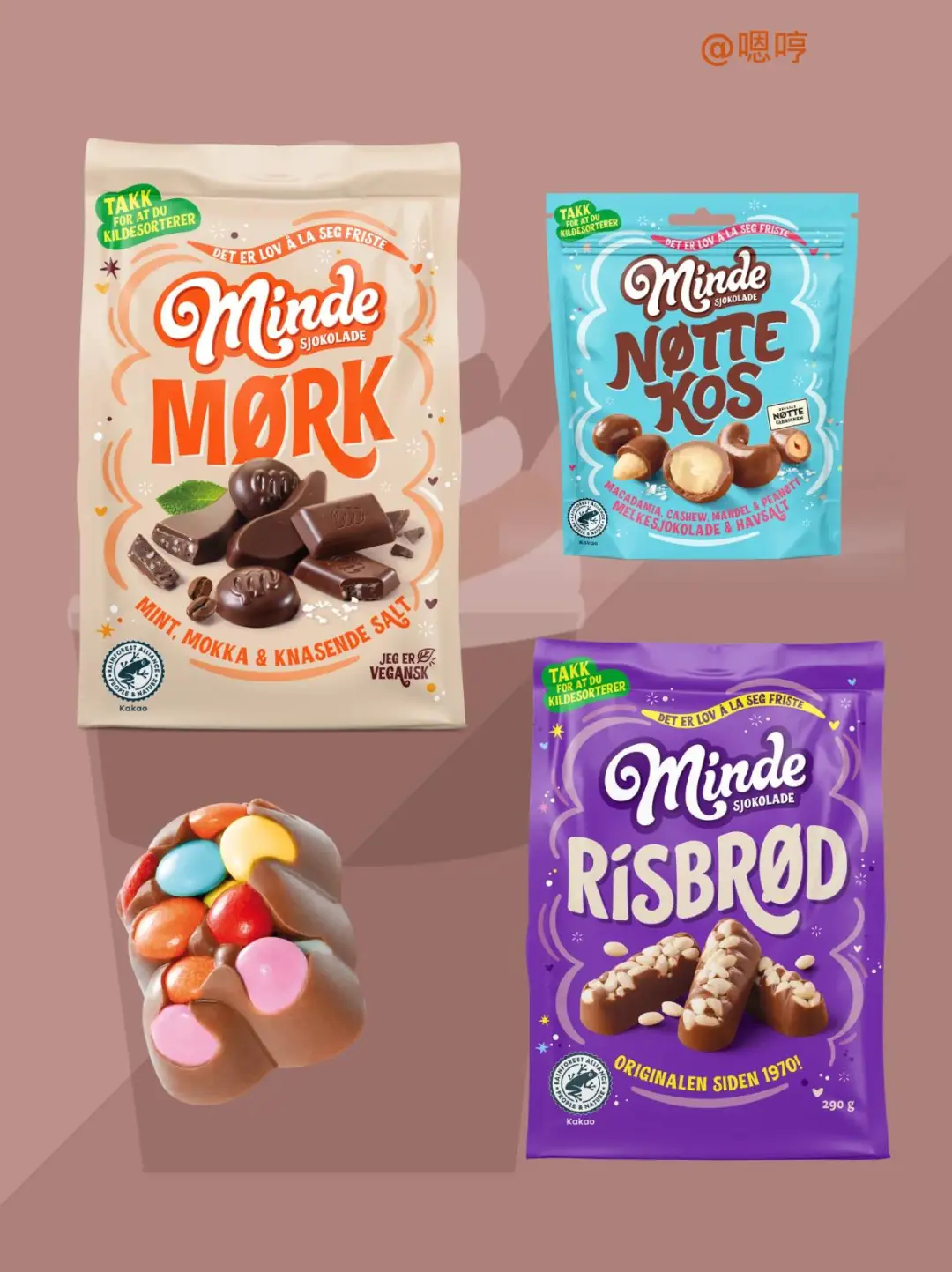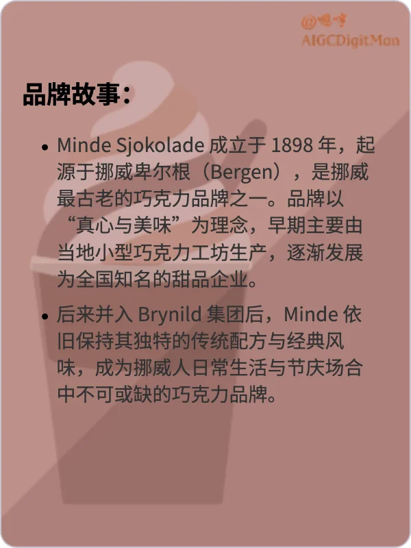 后来并入 Brynild 集团后,Minde 依旧保持其独特的传统配方与经典风味,成为挪威人日常生活与节庆场合中不可或缺的巧克力品牌。