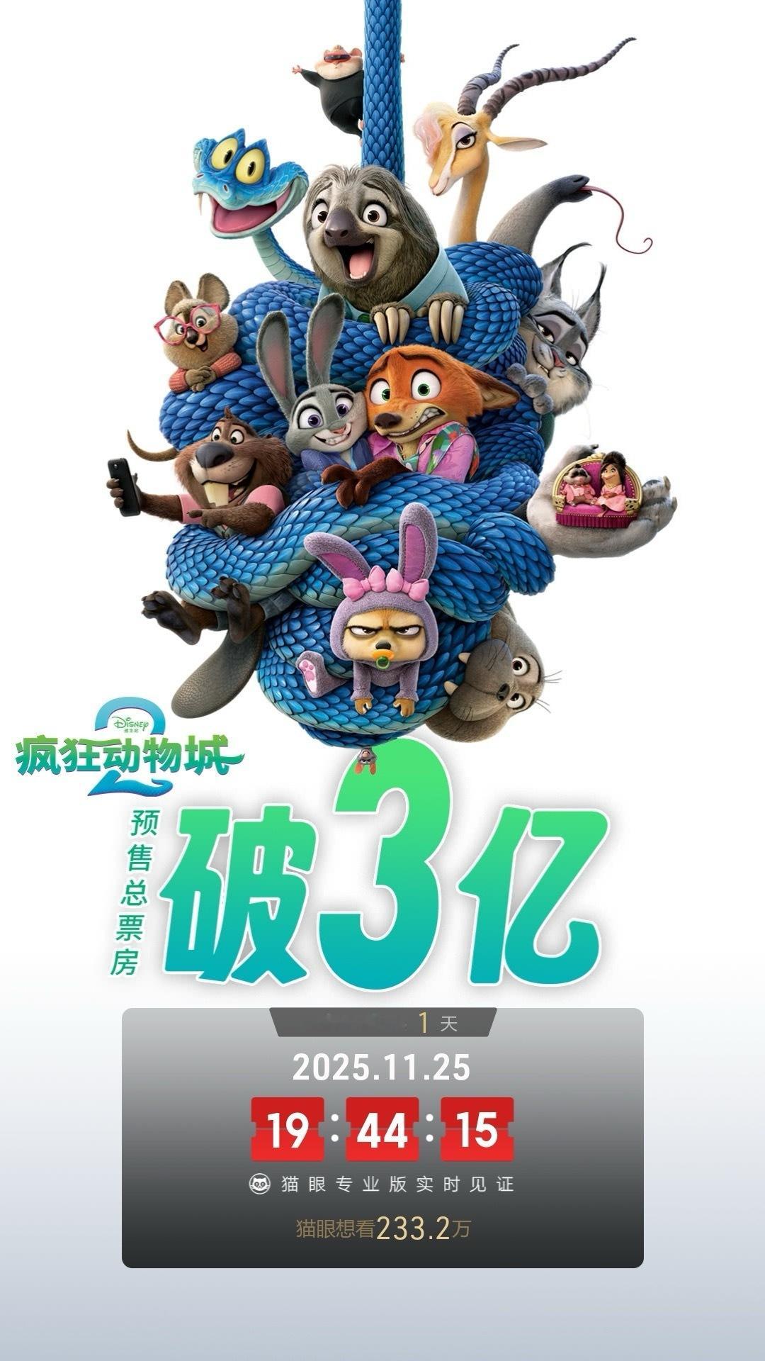 据猫眼专业版数据,电影《疯狂动物城2》映前1天,点映及预售总票房破3亿