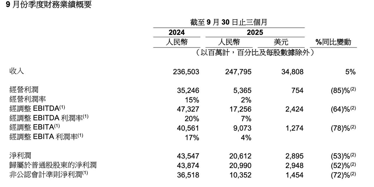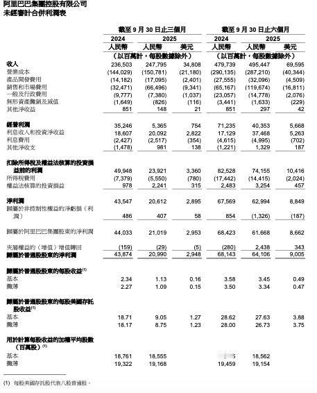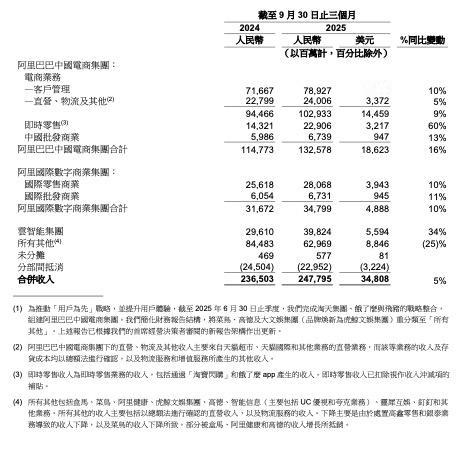 阿里2026Q2营收2478亿元,净利润210亿元 收入为2,477.95亿元,同比增长5%。若不考虑高鑫零售和银泰的已处置业务的收入,同口径收入同比增长将为15%。 阿里巴巴中国电商集团 电商业务收入为1,029.33亿元,同比增长9%。 客户管理收入同比增长10%,主要由于Take rate的提升所致。 电商业务的直营、物流及其他收入为240.06亿元,同比增长5%,主要受物流服务和增值服务的收入增长所驱动,部分被若干直营业务的收入下降所抵消。 即时零售业务收入为229.06亿元,同比增长60%,主要得益于2025年4月底推出的“淘宝闪购”所带来的订单量增长。中国批发商业收入为67.39亿元,同比增长13%。增长主要来自提供给付费会员的增值服务收入增长。 云智能集团收入为398.24亿元,同比增长34%。整体收入(不计来自阿里巴巴并表业务的收入)同比增长29%,主要由公共云业务收入增长所带动,其中包括AI相关产品采用量的提升。 所有其他分部收入为629.69亿元,同比下降25%,主要是由于处置高鑫零售和银泰业务导致的收入下降,以及菜鸟的收入下降所致,部分被盒马、阿里健康和高德的收入增长所抵消。 阿里国际数字商业集团收入同比增长10%至347.99亿元。经调整EBITA盈利1.62亿元。 云智能集团收入为398.24亿元。总收入及不计阿里巴巴并表业务的收入同比增长分别加速至34%及29%。 营业成本为1,507.81亿元,同比增长4.7%,占收入比例60.8%。 产品开发费用为170.95亿元,同比增长20.5%,占收入比例6.9%。销售和市场费用为664.96亿元,同比增长104.8%,占收入比例26.8%。一般及行政费用为73.80亿元,同比下降24.5%,占收入比例3.0%。 经营利润为53.65亿元,同比下降85%,主要是由于经调整EBITA的减少所致。经调整EBITA(一项非公认会计准则财务指标)同比下降78%至90.73亿元。 归属于普通股股东的净利润为209.90亿元。净利润为206.12亿元,同比下降53%,主要是由于经营利润的减少所致。截至2025年9月30日止季度,非公认会计准则净利润为103.52亿元,同比下降72%。 经营活动产生的现金流量净额为100.99亿元,同比下降68%。截至2025年9月30日,现金及其他流动投资为5,738.89亿元。