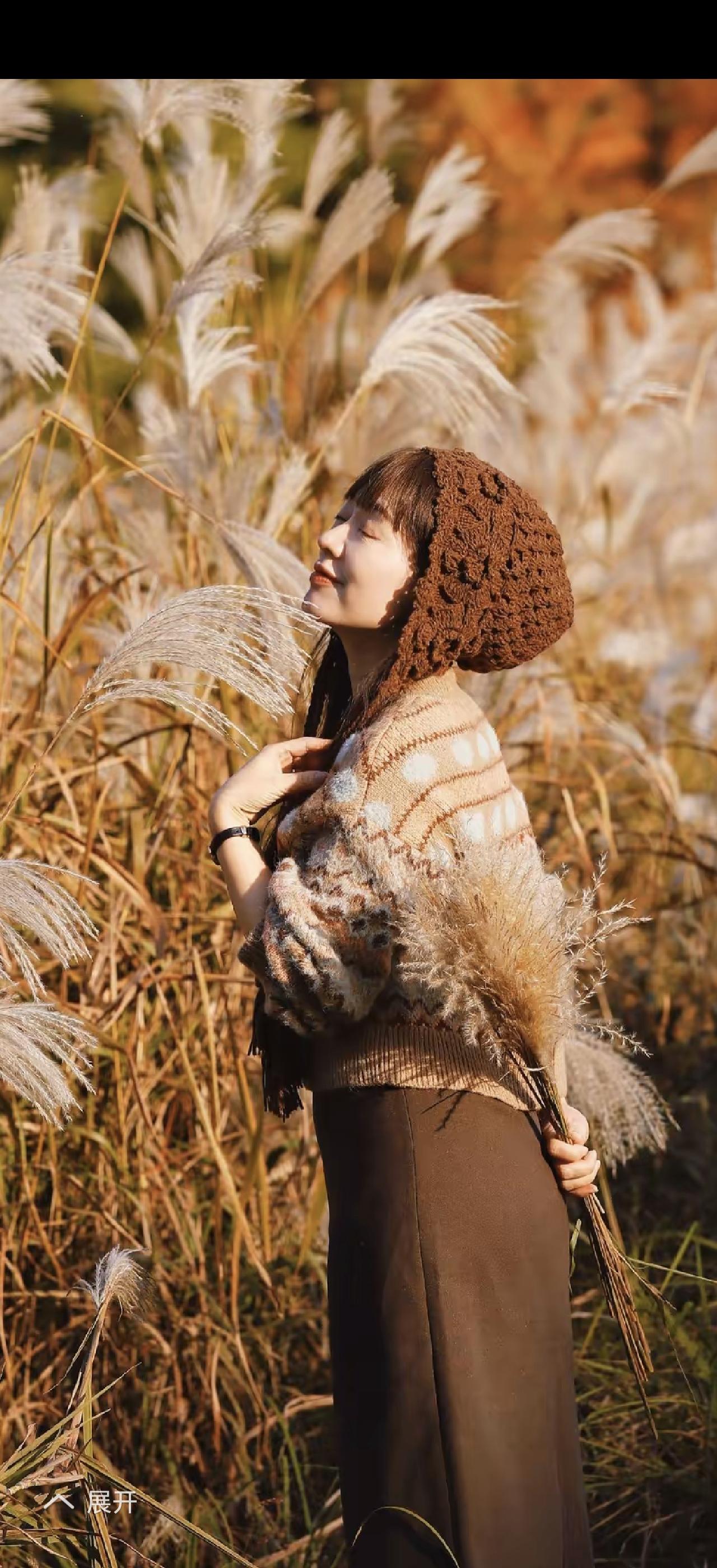 秋日暖阳下,格子围巾与棕色裙摆的完美搭配,尽显优雅与温暖。