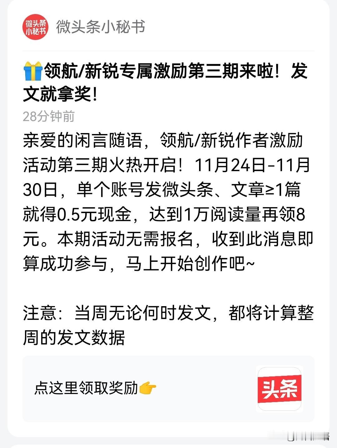 被几个朋友提醒后,我才惊觉,原来是我看错了,本周头条的激励活动根本没有那么大的力度… 简单来说,在这次活动中,只要发布至少1篇内容,就能为自己的账号解锁0.5元奖励,如果一周内所有作品总阅读量能达到1万,就能再解锁8元奖励。 也就是完成任务后,能额外得到8.5元,这次我的理解对了吧? 其实知道真相后,我是舒了一口气,挺好,我又可以躺平了,明天继续摸鱼!