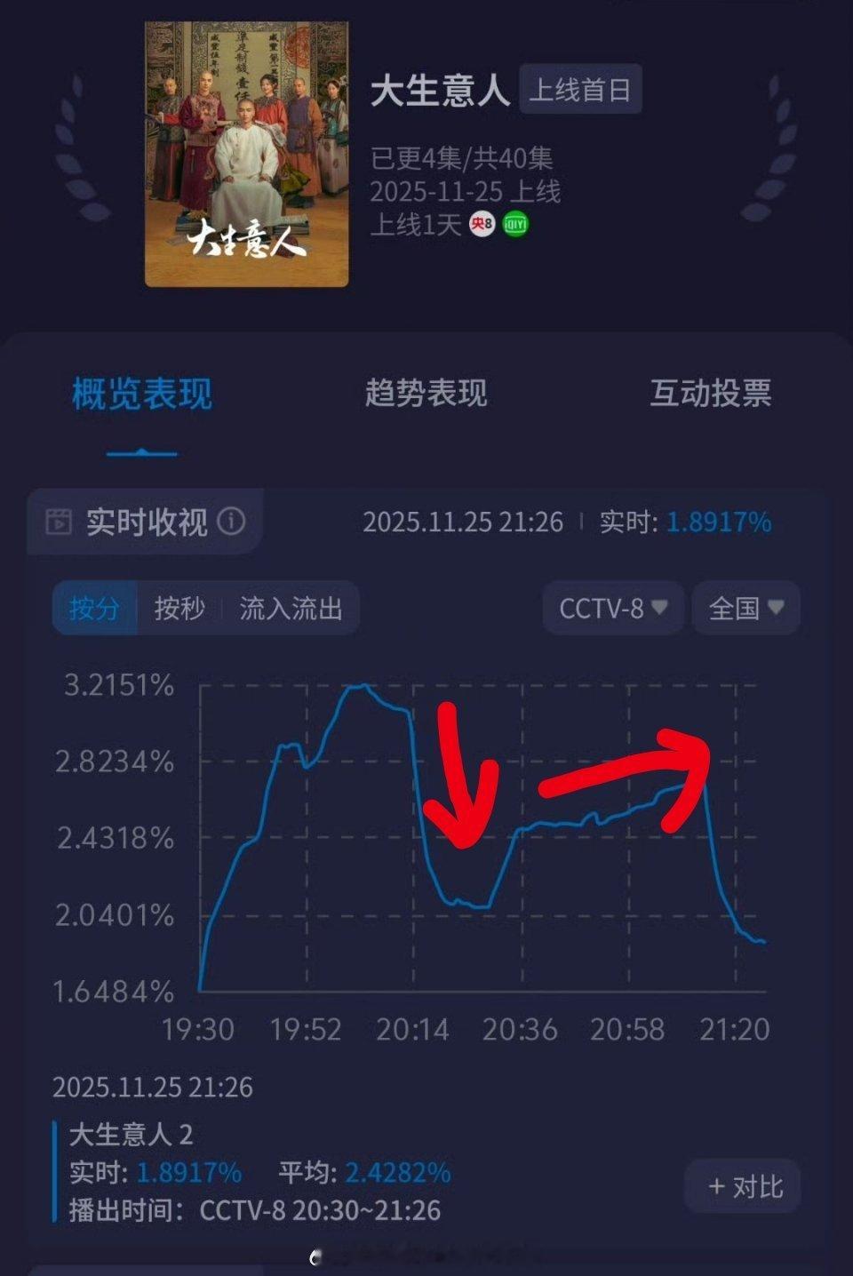 《大生意人》虽然酷云破3,但是它接的可是《四喜》大结局3.3的盘。而且黄金时段八点后走势飞速flop,新剧看三天,看能不能撑住三天吧。