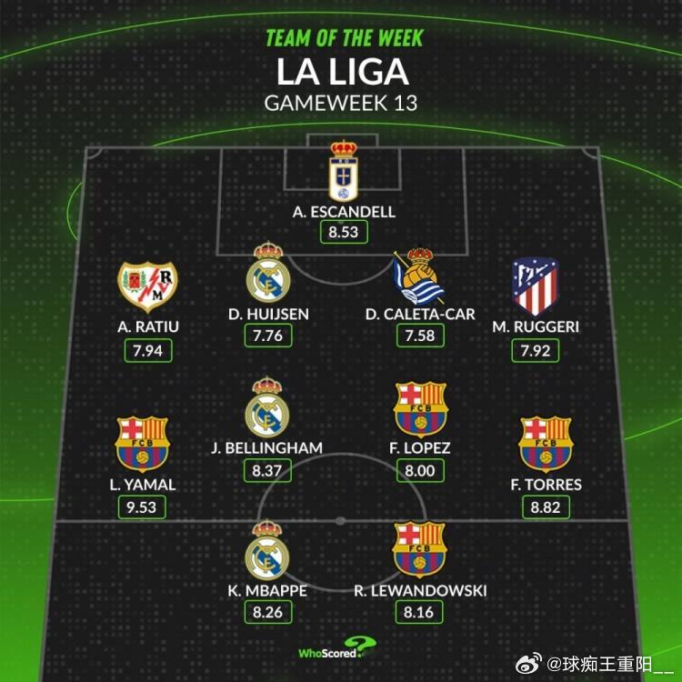 whoscored西甲本轮最佳阵:门将:阿隆·埃斯坎德尔(皇家奥维耶多,8.53分)后卫:安德迪·拉提乌(巴列卡诺,7.94分)、迪恩·赫伊森(皇家马德里,7.76分)、杜耶·卡莱塔·卡尔(皇家社会,7.58分)、马特奥·鲁杰里(马竞,7.92分)中场:拉明·亚马尔(巴塞罗那,9.53分)、裘德·贝林厄姆(皇家马德里,8.37分)、费尔明·洛佩斯(巴塞罗那,8.00分)、费兰·托雷斯(巴塞罗那,8.82分)前锋:基利安·姆巴佩(皇家马德里,8.26分)、罗伯特·莱万多夫斯基(巴塞罗那,8.16分)