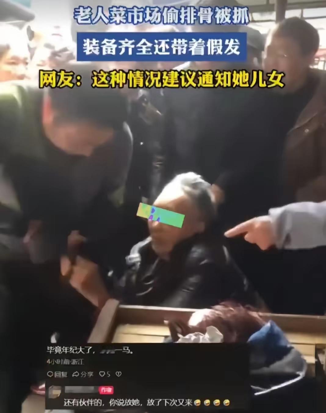 四川菜市场这大妈绝了!偷个排骨而已,居然还戴假发伪装,这装备整得跟执行“特工任务”似的,被抓时假发一掉,围观的人直接看傻了眼! 大妈趁老板忙得团团转,悄悄把排骨往包里塞,那动作又快又隐蔽,要不是老板眼尖,还真让她得手了。被当场拦住后,有人劝老板“年纪大了,算了算了”,结果老板直接怼回去:“她还有同伙呢!” 这话一出,大家更震惊了,合着还是团伙作案?一把年纪了,不好好享清福,反倒干起偷鸡摸狗的事,还特意整个假发掩人耳目,真是把心思用错了地方。 别拿年纪当遮羞布,偷东西就是不对,跟年龄没关系!越是纵容,越容易让这种歪风邪气滋生。网友都喊着要通知她儿女,这脸丢得,估计儿女知道了都得臊得慌。 有这动歪心思的功夫,踏踏实实买点不好吗?你觉得该怎么治这种“倚老卖老”的偷窃行为?