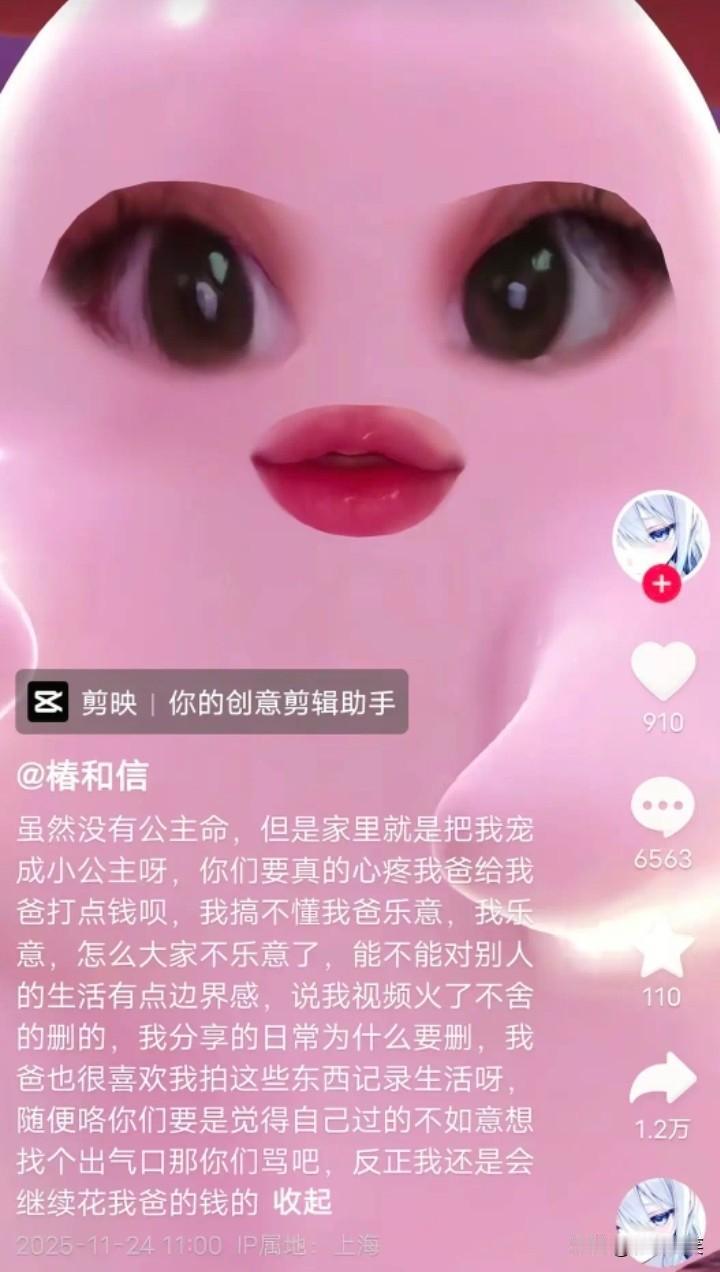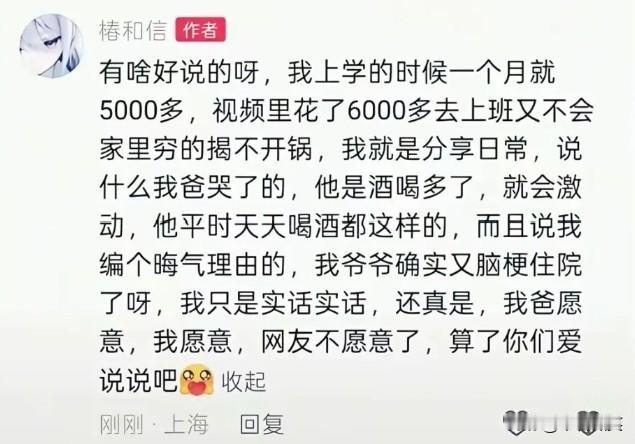 这就是“富养女儿”的结果吗?上海的一个女孩上了一个星期班,花了爸爸6600块钱,女孩笑着对爸爸说:“我又辞职了,爸爸,你知道我用的什么借口吗?我说爷爷的脑梗又严重了,我们要带她去别的医院治疗。” 爸爸听到女儿辞职了,掩面哭泣,露出了他的断指。 当网友们指责女孩时,女孩反驳:“我上学的时候一个月就5000块钱生活费,我爸哭了是因为酒喝多了,我愿意,我爸愿意,网友们不愿意了!” 后来又发了一个视频:“虽然没有公主命,但家里就是把我宠成小公主了呀!你们心疼我爸给我爸打点钱呗!” “我搞不懂我爸乐意,我乐意,网友们怎么就不乐意了!能不能对别人的生活有点边界感?你们觉得生活不如意想找个出气口那你们就骂吧!反正我还是会继续花我爸的钱的!” 大家之所以指责女孩,是因为心疼女孩的父亲,把女儿长大成人,本以为她可以靠自己的双手挣钱养活自己,没想到依然在“啃老”,一个星期花了6600块钱买东西,还把工作辞了。