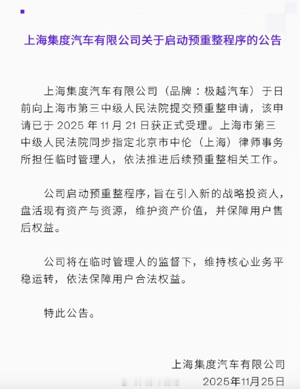 上海集度汽车有限公司发布了关于启动预重整程序的公告,并计划引入新的战略投资人,盘活现有资产与资源,维护资产价值,并保障用户售后权益。极越真的要回来了吗?