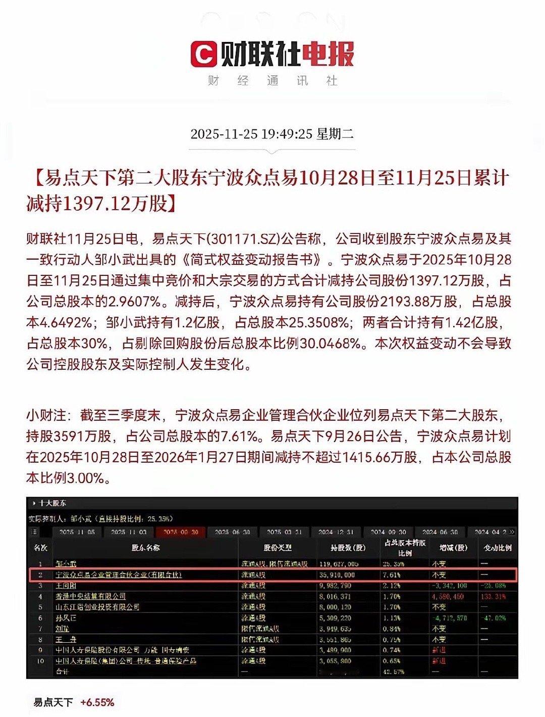 易点天下突发公告!第二大股东宁波众点易10月28日至11月25日累计减持1397.12万股减持的真快啊,此前公司公告是三个月减持完,现在一个月不到就成功全部减持了,个人认为易点天下的二股东必须要做面锦旗送给拉升的游资,感谢拉升的游资,感谢拉萨团结路,正因为你们的积极参与,精准点火易点天下,才使得公司股东们能在高位精准减持,不禁让人感叹一下,上市真好啊,做股东真香啊,高位减持真是太美妙了!5.4万易点天下的中小股东,坐稳扶好,受此消息影响,易点天下恐怕要迎来大震荡行情了,接下来该怎么办,应该心里有数了吧!