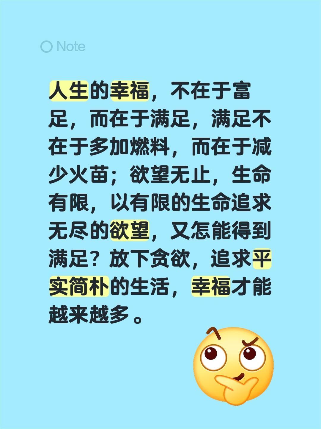 人生的幸福,不在于富足,而在于满足,满足不在于多加燃料,而在于减少火苗;欲望无止,生命有限,以有限的生命追求无尽的欲望,又怎能得到满足?放下贪欲,追求平实简朴的生活,幸福才能越来越多。