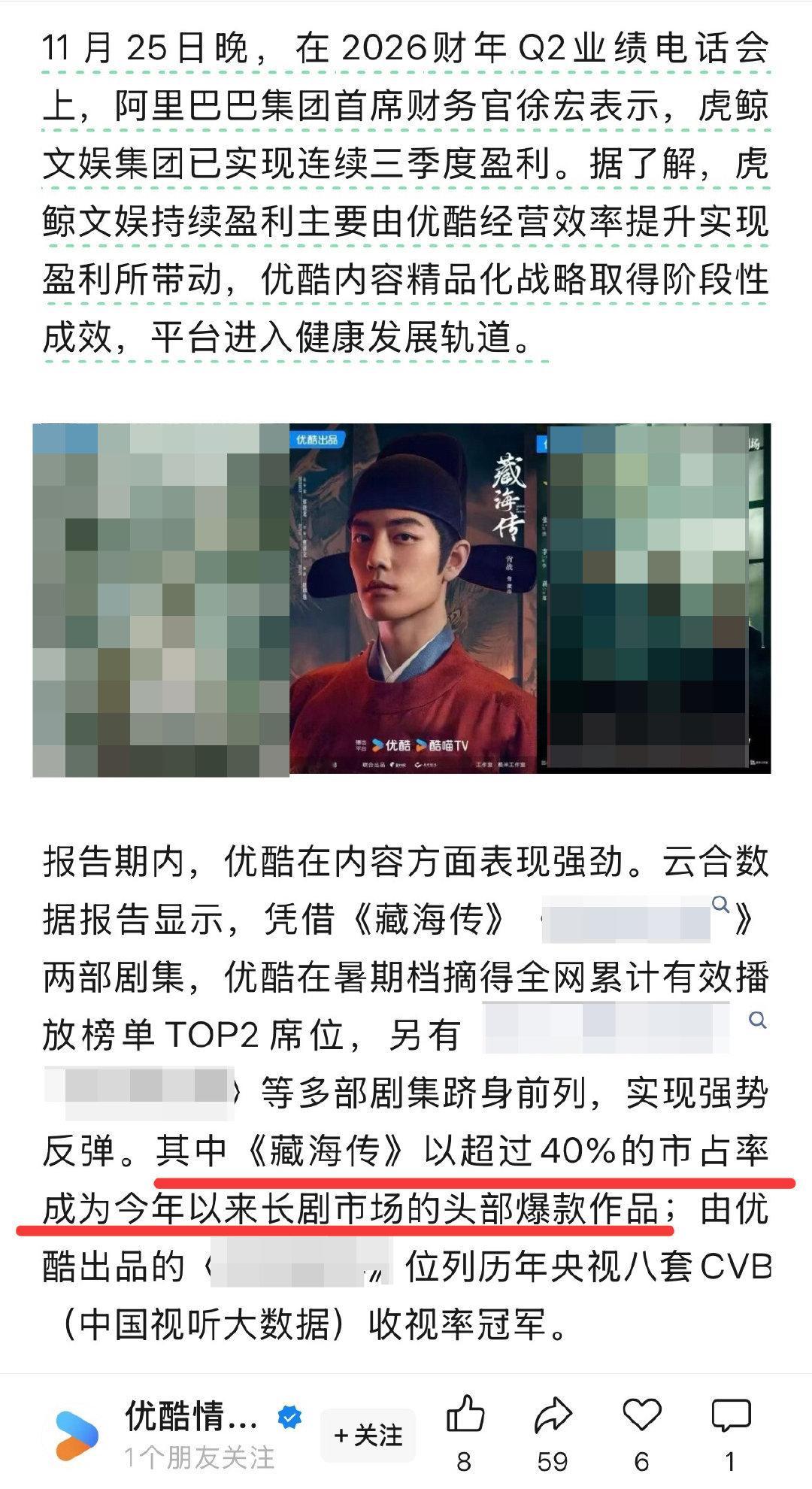 阿里财报Q2电话会议阿里CFO:肖战《藏海传》超过40%的市占率成为今年以来长剧市场的头部爆款