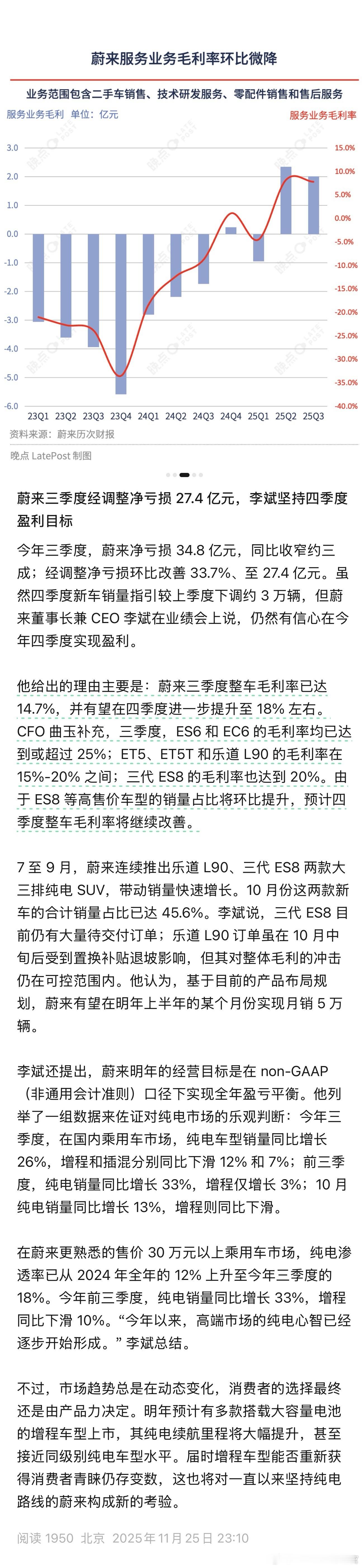 蔚来发了三季度财报,大家最关心的净亏损是 34.8 亿元,同比收窄约三成李斌对四季度盈利仍然有信心,他说蔚来有高毛利车型。比如全新 ES8 的订单非常强劲,还有非常多的库存订单三季度综合毛利率 13.9%,整车毛利率 14.7%,都是近三年新高现在蔚来账上还有 367 亿的现金储备