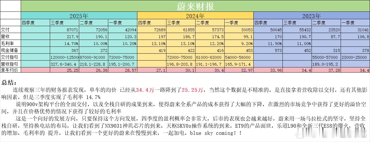 总结: 连续观察三年的财务报表发现,单车的均价 已经从34.4万一路降到了25.25万,当然这个数据是不精准的,是直接拿着营收除以交付,还有其他影响因素,但是三季度实现了毛利率 14.7% 说明900v架构平台的全面交付,以及全栈自研的成果到来,使得蔚来全系产品的成本获得了大幅的下降,在激烈的市场竞争中获得了更好的溢价空间,并且在价格优势的情况下获得了较好的毛利率 这是一个向好的发展方向,只要保持这个方向发展,四季度的盈利概率会非常大,后市的表现也会越来越好,蔚来用一场马拉松式的坚守,坚持全栈自研,坚持换电站的布局,让我们看到了NX9031神玑芯片的到来,天枢SKY0s操作系统的到来,ET9的产品面世,乐道L90和全新三代ES8的爆火,营收的增加,毛利率的 提升,让我们看到一个更好的蔚来在慢慢到来,一起加电,blue sky coming!!
