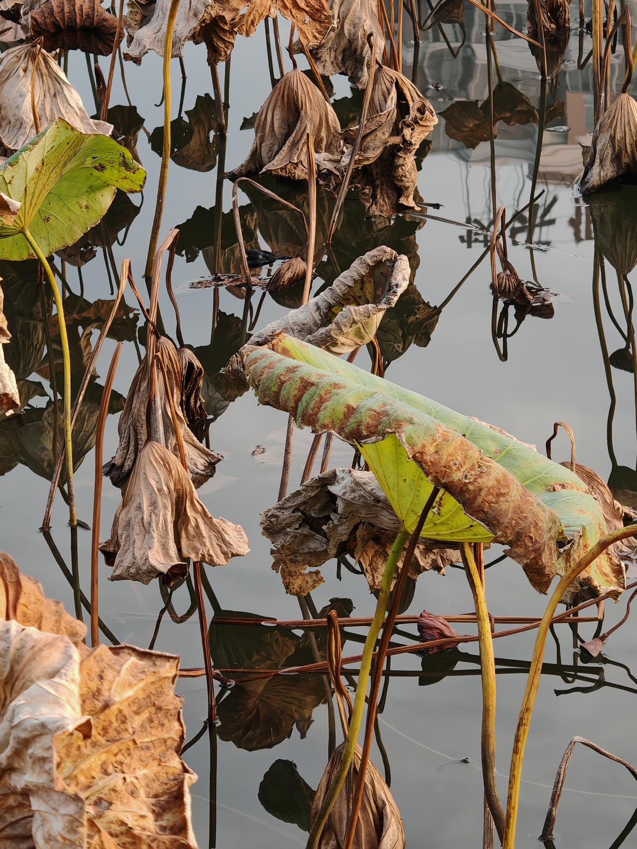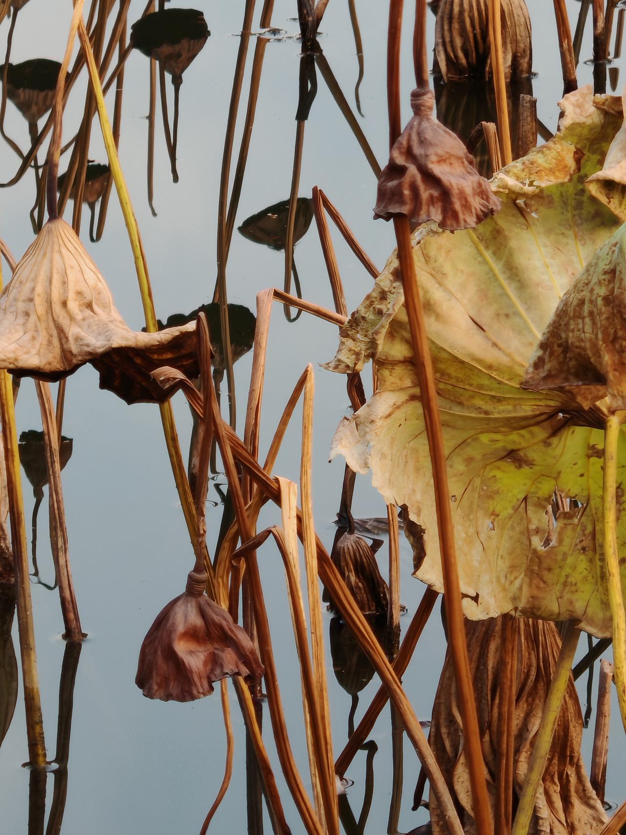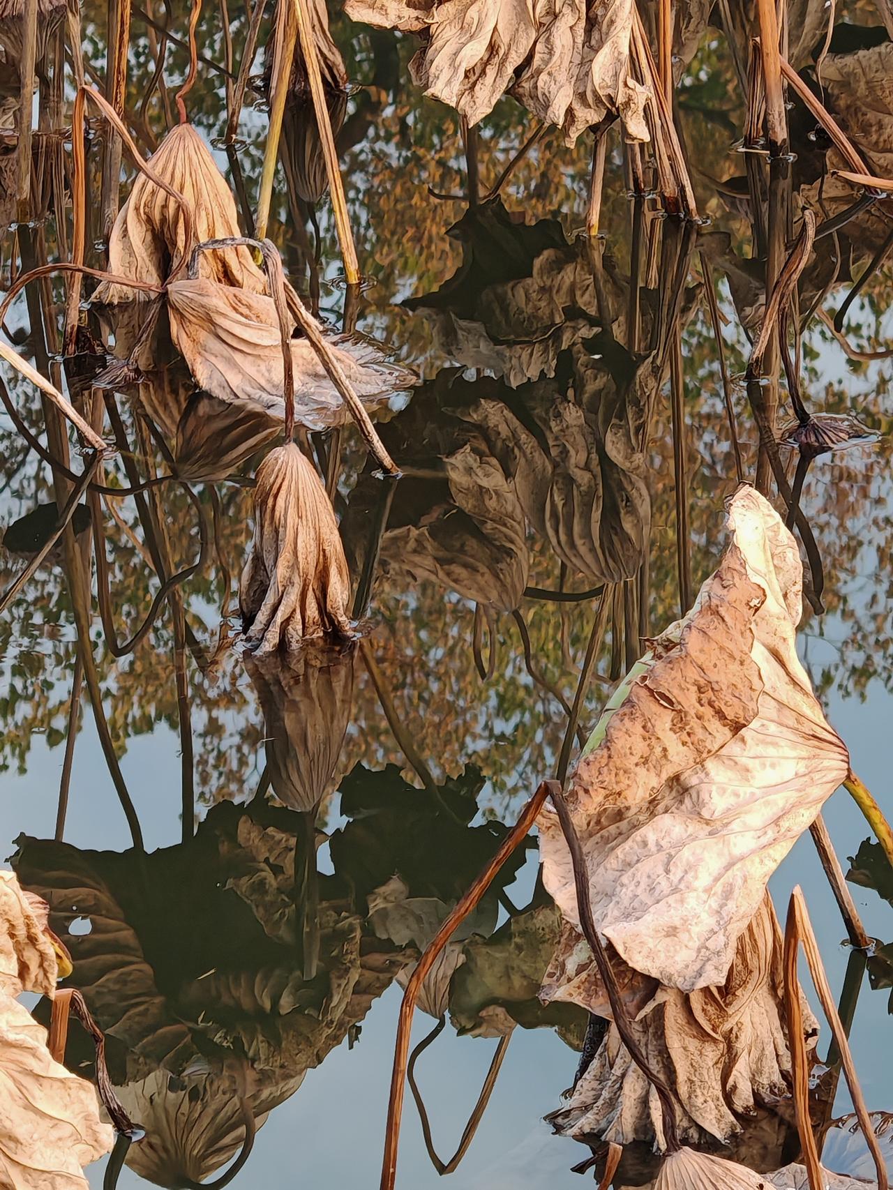 秋日静谧,枯叶飘零,倒映在清澈的湖水中,仿佛时间静止。