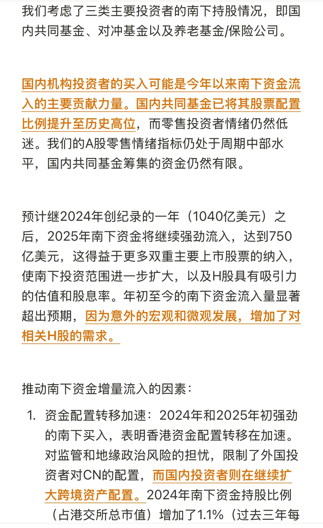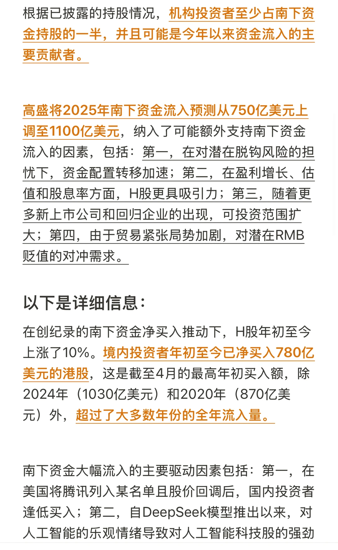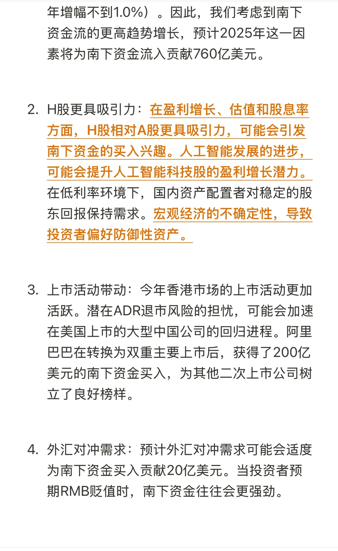 高盛将2025年南下资金流入预测从750亿美元上调至1100亿美元,纳入了可能额外支持南下资金流入的因素,包括:第一,在对潜在脱钩风险的担忧下,资金配置转移加速;第二,在盈利增长、估值和股息率方面,H股更具吸引力;第三,随着更多新上市公司和回归企业的出现,可投资范围扩大;第四,由于贸易紧张局势加剧,对潜在RMB贬值的对冲需求。