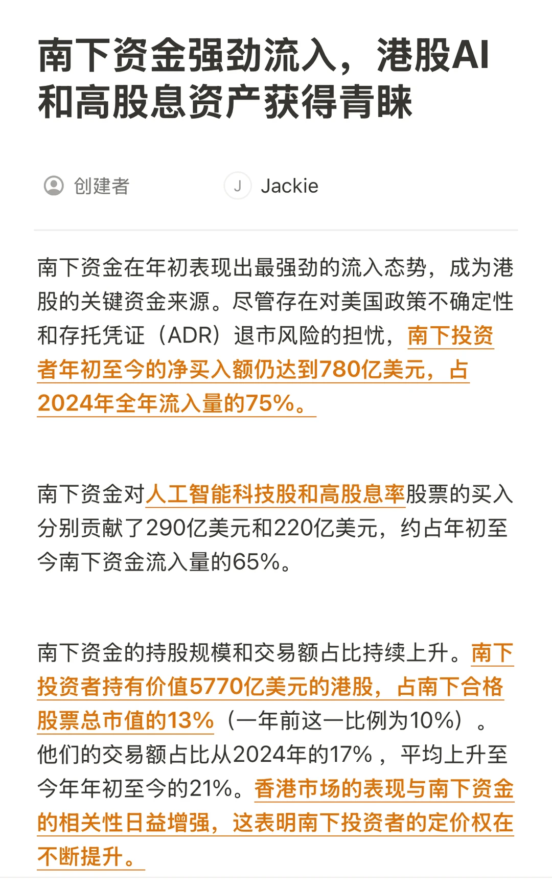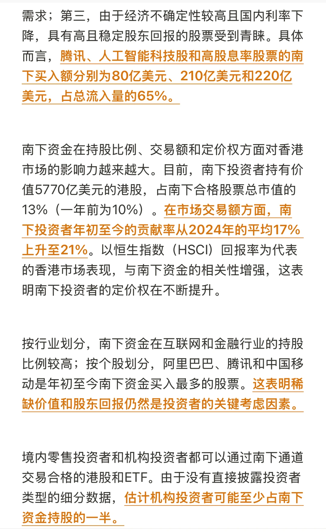 南下资金对人工智能科技股和高股息率股票的买入分别贡献了290亿美元和220亿美元,约占年初至今南下资金流入量的65%。