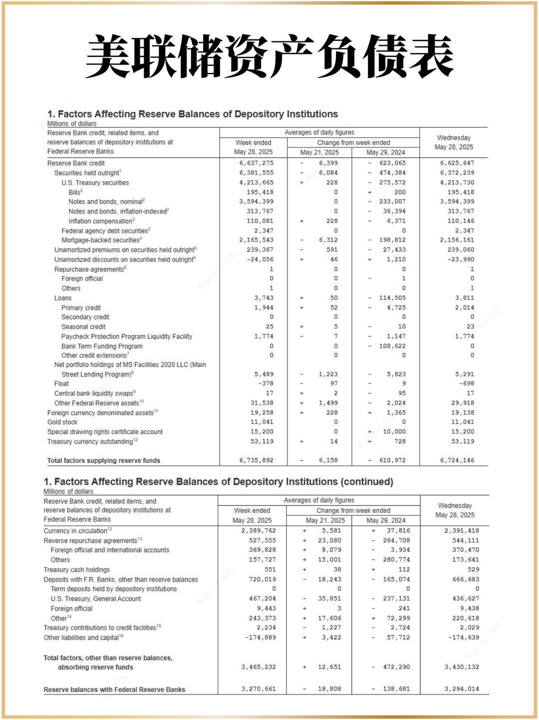 财政部在美联储的 TGA 账户是美联储负债端的重要科目。当财政部发行国债时,资金从市场流入 TGA 账户,导致银行准备金减少;而财政支出时,TGA 资金流向实体经济,准备金回升。这种机制使得 TGA 余额波动直接影响美联储负债端的流动性分布。例如,2025 年债务上限解决后,财政部重建 TGA 账户(如余额从 3000 亿美元增至 8300 亿美元),可能抽走约 5000 亿美元银行准备金。