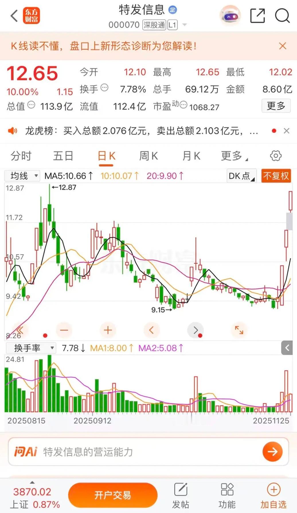 国晟科技三浪驱动,特发信息,实达集团冲击四和五连板国晟科技涨停收盘报收8.90元每股,成交金额7.04亿元,明日涨停板9.79元每股,突破近期高点9.37元每股,总市值58.44亿元,市值有望突破百亿元。特发信息涨停板收盘报收12.65元每股,成交金额8.60亿元,明日争取4连板。实达集团涨停板收盘报收5.59元每股,成交金额15.25亿元,4连板,明日必成5连板,福建股人气冲天,涨涨涨今日有只新股上市发行,N海安涨幅达到74.00%,收盘报收83.52元每股,最高100元每股,福建股,每签能挣17760元。