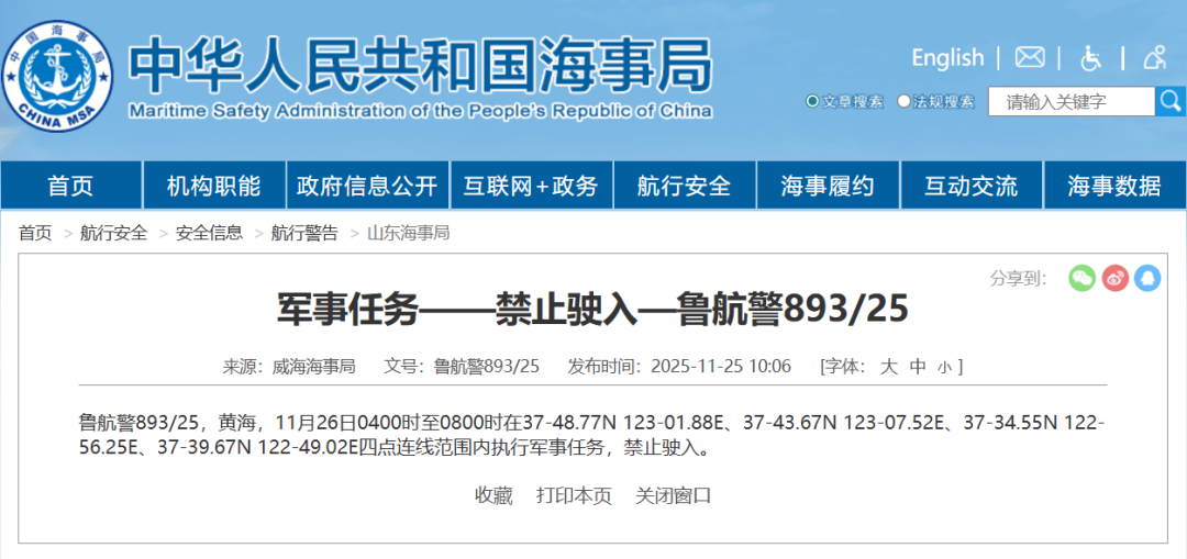 【 黄海部分海域执行军事任务】威海海事局发布航行警告:据中国海事局网站消息,威海海事局发布航行警告,11月26日4时至8时,黄海部分海域执行军事任务,禁止驶入。射击试验—云航警88/25连云港海事局发布航行警告:云航警88/25,黄海南部,11月26日至12月3日每日0800时至1800时,在34-52.69N 119-20.31E、34-51.86N 119-23.82E、34-48.53N 119-23.55E、34-45.95N 119-19.73E、34-49.98N 119-18.95E诸点连线范围内进行射击试验。禁止驶入。近一段时间,中国海事局网站在黄海海域连发多条航行警告。多个警告提示:执行军事任务,禁止驶入。