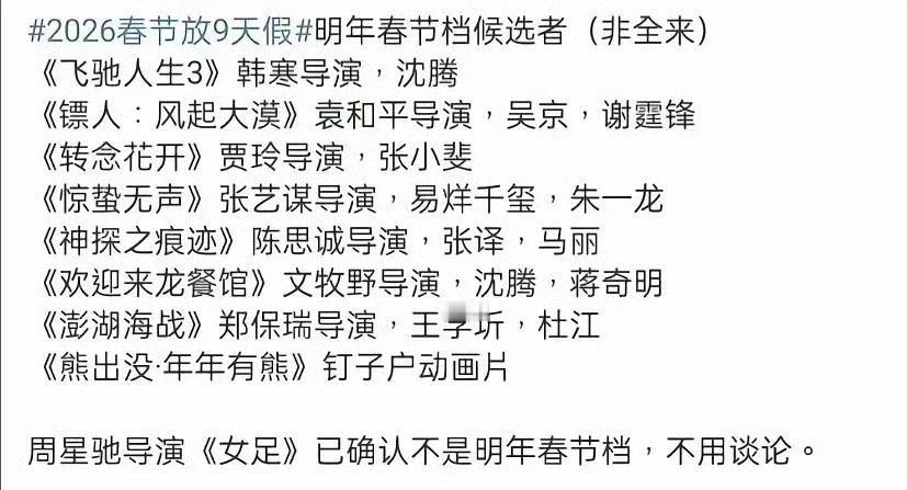明年春节档也太卷了吧!贾玲转型拍现实犯罪片,张艺谋带神仙阵容解锁国安谍战,吴京闯大漠演绎硬核武侠,韩寒再续赛车热血传奇。四位实力派各放大招,题材质感全在线,钱包和时间已经提前预留,就等影院蹲一波巅峰对决!贾玲