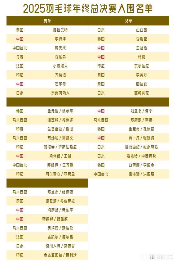 【羽联年终总决赛五项八强全落位!卫冕冠军石宇奇王祉怡领衔!】 昨晚深夜,世界羽联公布2025年终总决赛五项入围名单,国羽五项均有球员入选。 【男单】石宇奇、李诗沣; 【女单】王祉怡、韩悦; 【男双】梁伟铿/王昶; 【女双】刘圣书/谭宁、贾一凡/张殊贤; 【混双】冯彦哲/黄东萍、蒋振邦/魏雅欣。 除了男双只有一组入围,其余四项国羽均是双保险入围。去年年终总决赛,国羽斩获男单、女单和混双三项冠军,今年石宇奇、王祉怡领衔出战,期待卫冕,郑思维/黄雅琼于去年底宣布退出国际赛场,略有遗憾。