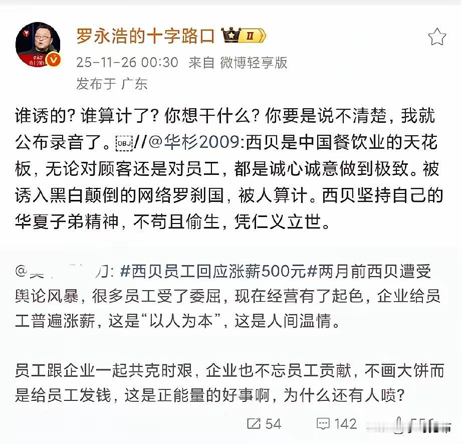 网络舆论这方面,他们捆在一起,都玩不过罗永浩,所以就别聊闲了,那样就丢人现眼了。 华杉转发别人转发的该文并评论说,西贝是中国餐饮业的天花板,无论对顾客还是对员工,都是诚心诚意做到极致。被诱入黑白颠倒的网络罗刹国,被人算计。西贝坚持自己的华夏子弟精神,不苟且偷生,凭仁义立世。 罗永浩进一步转发华杉发文,并且提出了自己的观点: 谁诱的?谁算计了?你想干什么?你要是说不清楚,我就公布录音了。