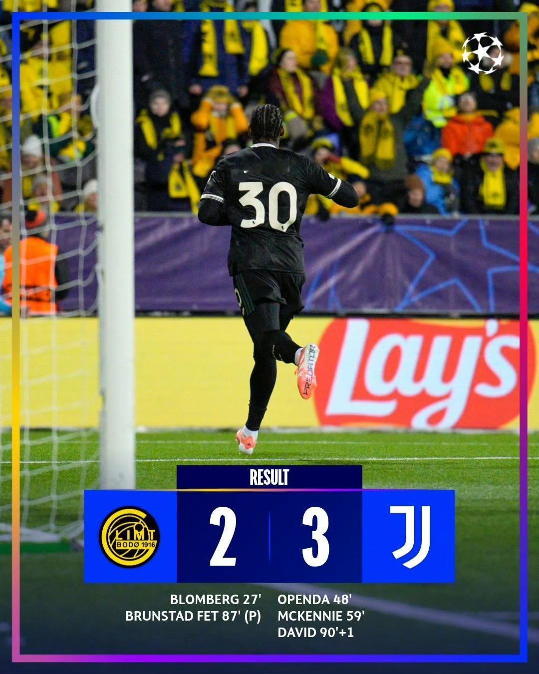 欧冠第5轮尤文客场3:2博德闪耀拿下一场久违的欧冠胜局,奥蓬达 戴维终于开胡打破进球,伊尔迪兹当选本场最佳球员并为斑马军团出场100场里程碑。🔥 48'奥蓬达 59'麦肯尼 90+戴维