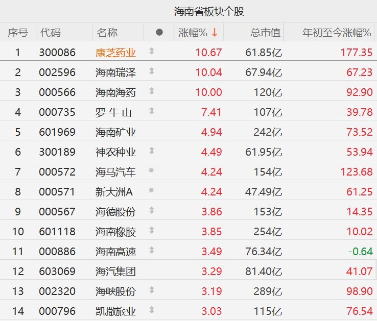 【 ,海南瑞泽、海南海药涨停】 11月26日,A股市场海南板块集体活跃,其中,康芝药业涨超10%,海南瑞泽、海南海药10CM涨停,罗牛山涨超7%,新大洲A、海南矿业、神农种业、海马汽车涨超4%,海德股份、海南橡胶、海南高速、海汽集团、海峡股份、凯撒旅业涨超3%。