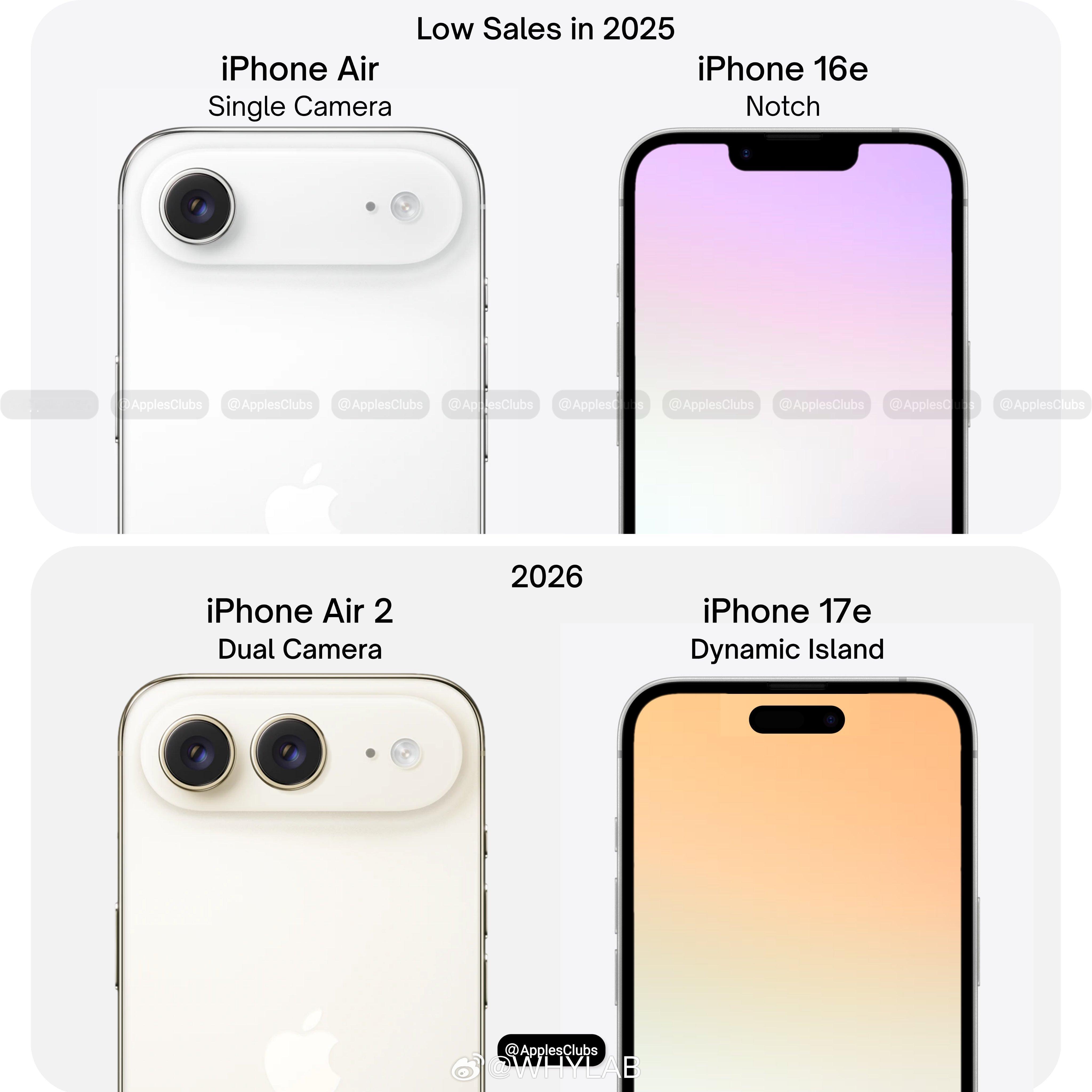 苹果今年的 iPhone Air 和 iPhone 16e 销量都不行,看接下来的迭代产品能不能扭转颓势,一个变成双摄,一个刘海屏改灵动岛。
