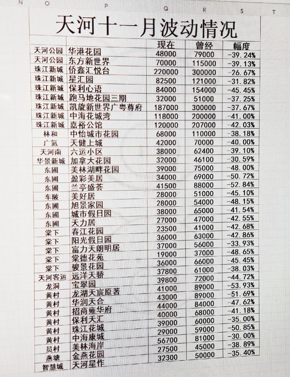 统计完天河跌的情况,我emo了。。。 贵为广州核心的天河,居然能平均滑坡四十多个点,不过我觉得每个盘都有人为了生活或者生意不顾一切的拋房,导致每个盘目前都异常低价,这波过去又恢复正常了,不信你后面看。