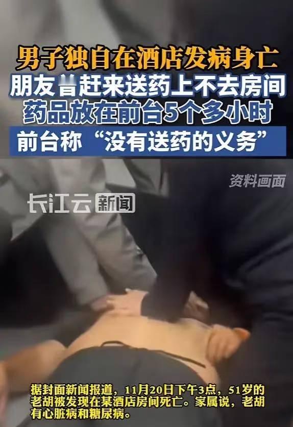 “悲剧还是发生了!”11月20日,湖北武汉,一老人在酒店内突发急病,朋友赶来送药因说不出老人全名上不去,前台以“没有义务”为由,拒绝查询送药,最终导致老人身亡,而酒店如今只愿意赔偿2万元。网友:应该打110! 51岁的老胡在11月19日晚入住武汉某酒店,他平时在老家经营农业合作社,这次是外出办事。第二天上午9点多,老胡感到心脏不适,给朋友打电话求助送药。 朋友是老胡少年时期的好友,但两人多年未见,朋友只知道老胡的绰号,并不清楚他的全名。他迅速取了药,在9点40分赶到酒店前台。当时老胡的电话已经无人接听,朋友向前台说明情况,告知住客姓胡,是前一晚入住的男性,请求帮忙查询住客信息并送药上楼。 酒店前台以“没有义务帮忙”为由拒绝了朋友的请求,要求他自行联系客人。朋友在现场多次拨打老胡电话均无人接听,因有急事需处理,只得将药留在前台并微信留言后离开。 治疗高血压、心绞痛的药品在前台放了五个多小时,这期间,酒店工作人员没有进行任何排查。直到下午3点,保洁人员打扫房间时,才发现老胡倒在地上已死亡。法医推断死亡时间在中午12点至下午2点之间。如果药物能及时送达,或许能为老胡争取到宝贵的抢救时间。 老胡的家人感到无比痛心,他们认为酒店在发现客人电话长时间无人接听这种异常情况后,没有及时排查,耽误了抢救时机,应该为此承担责任。家人表示,老胡的父母已80多岁,家里刚刚添了孙子,他与儿子经营农业合作社还有上百万元的贷款,今后的生活面临巨大困难。 涉事酒店集团回应称,送药者未告知前台病人病情,前台出于隐私考虑未查看药品内容。酒店方面还表示,该住客是金卡用户,可以延迟到下午3点退房,因此他们没有提前去查看。酒店承认前台人员“没有多做一步”,但否认说过“没有义务帮忙送药”的话,并表示不会逃避责任,正在积极处理。在相关部门组织的调解中,酒店方态度比较强硬,只愿意提供两万元的人道主义补偿。 酒店作为经营方,对房客生病的情况是有义务照顾的,如果最终确认老胡是因心脏病等急性发病死亡,酒店方应对死亡承担一部分责任。当前消费场景下,房客临时通过外卖买药的情况已很常见,酒店经营者应吸取教训,遇到客人买药后失联等异常情况时,需要更谨慎地核实处理。 规则是死的,人是活的,当生命可能受到威胁时,那份超越刻板流程的责任感与人性化的关怀,显得何其重要。 各位读者你们怎么看?欢迎在评论区讨论。