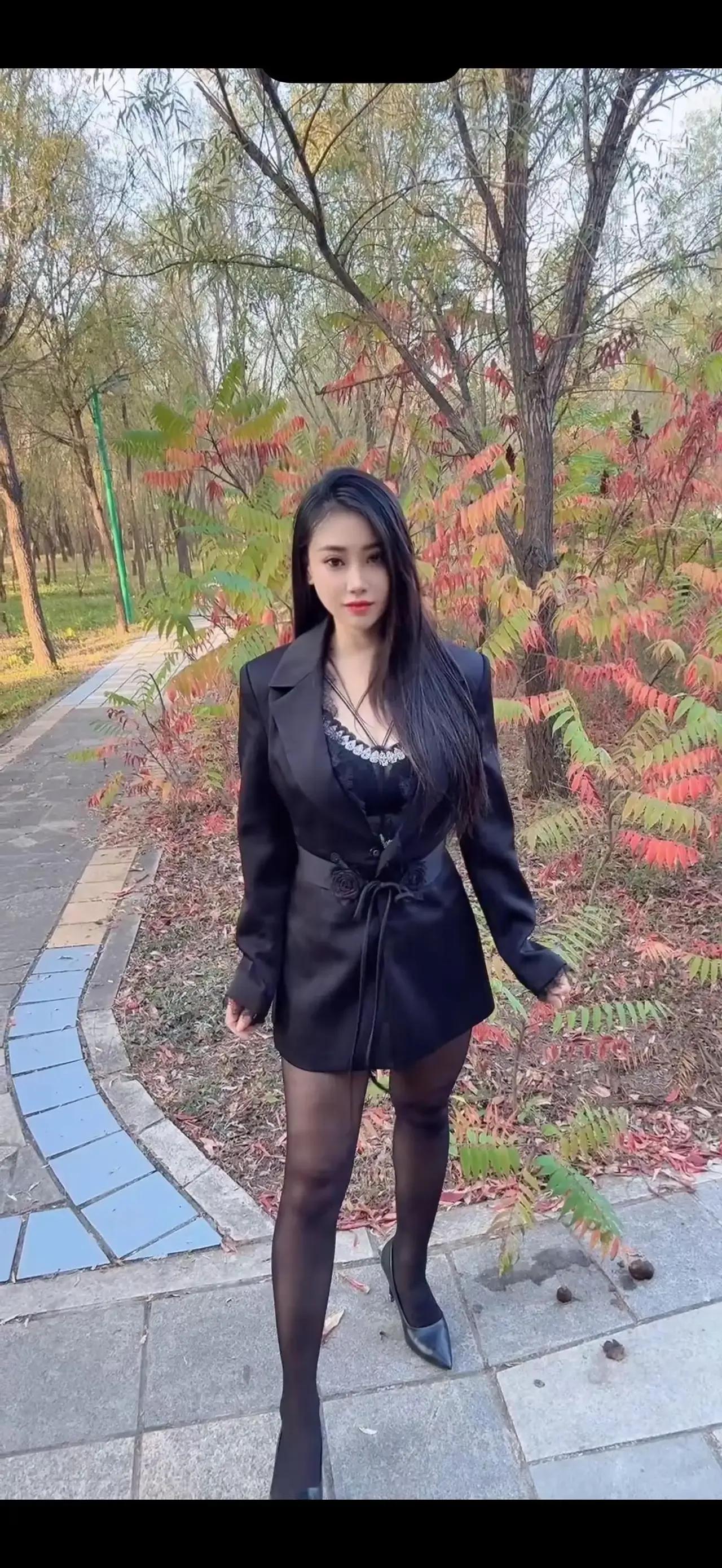 都市丽人 黑色皮衣搭配,时尚又帅气,坐在公园长椅上,尽显自信魅力!👗👠💄