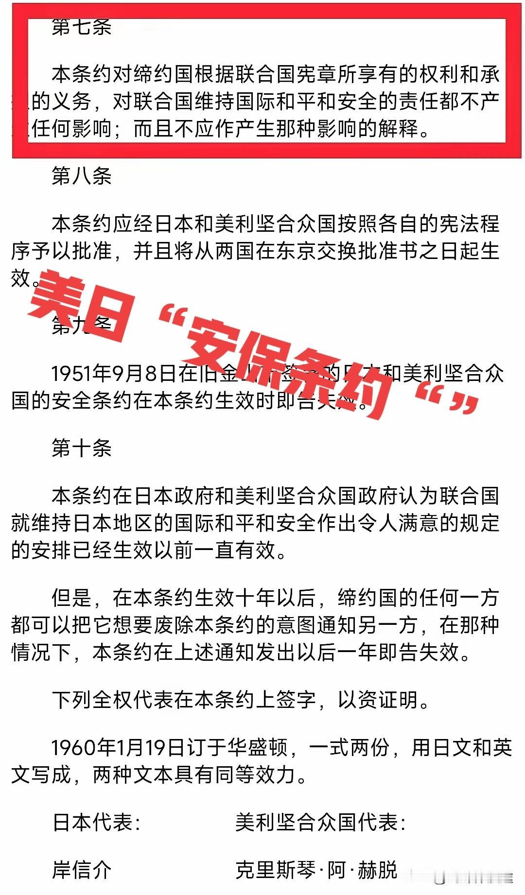 联合国“敌国条款”让“美日安保条约”失效! 《联合国宪章》“敌国条款”指《联合国宪章》第53条、第77条和第107条的相关规定,赋予反法西斯同盟国以和平与强制的手段及相关特权,制约法西斯战败国的东山再起,防止其复活侵略政策,抑制其可能重新发动侵略战争的政治与法律安排。 这些条款是在 1945 年二战胜利之后,中 美 苏 英 法 五国共同制定的国际条款,就是为了针对德国 意大利 及日本这样的法西斯国家再度武装入侵别国而制定的限令。以上三个曾经的法西斯国家如果有企图再入侵别国的军事行动,五个战胜国就可以无须经过联合国批准,直接对 德 意 日国家发动军事打击! 如今的日本政府企图以中国统一台湾之际,日本将派兵进入台湾 阻止中国的国家统一,这一性质表明 日本将要入侵中国的领土 台湾。为此中国可以无须受联合国授权对日本进行军事打击。 而此时美国与日本早期签定了“美日安保条约”规定:只要有一方领土受军事打击,另一方就将触发美日安保条约的集体自卫权,提供军事协助对方! 所以此时如果日本胆敢入侵台湾,中国将行使“敌国条款”的权力对日打击,而此时的美国将如何办呢?美国出兵协防日本,美国将违背作为战胜国制定的“敌国条款”的职责,如果美国不协助日本,美国又失信于“美日安保条约”。所以美国的位置就左右为难,进也不是,退也不是,美国将要如何处理呢? 但联合国的国际法远远大于 美日的 “安保条约”,所以美国不能出兵协助日本,否则美国将失信于作为一个战胜国的地位与职责。为此美日所谓的“安保条约”也将失效! 为此才有了特朗普急忙给日本政府打电话,并警告日本政府,更主要是让日本政府不要让美国难堪,让美国的国际地位受到挑战,不符合美国的利益。 所以美国遵重联合国的“敌国条款”,也就必定要让“美日安保条约”失效!