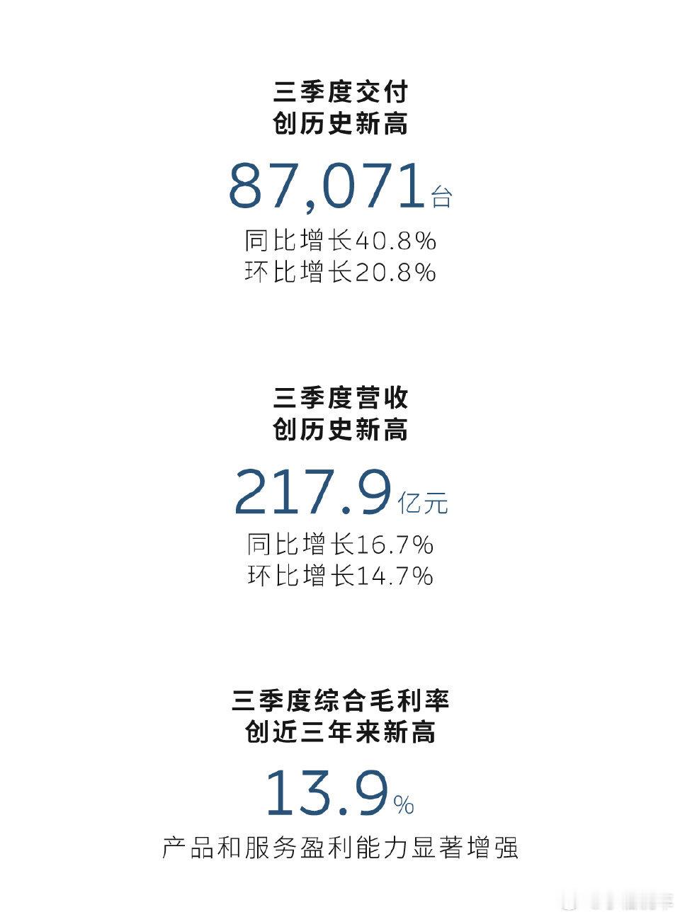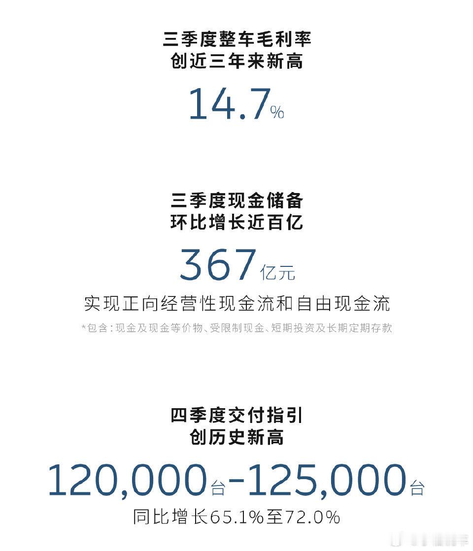 蔚来2025年三季度财报 蔚来这三季度财报是真让人眼前一亮!交付直接冲到87071台,同比涨40.8%还创了新高,实实在在的销量说明大家是真愿意为它买单。营收也跟着破纪录,217.9亿的成绩加上近三年最高的毛利(整车14.7%、综合13.9%),彻底打破了新势力“卖得多亏得多”的印象,现在是真能赚钱了。 更让人安心的是现金储备,367亿的家底还多了近百亿,现金流也转正了,再也不用操心它资金链的问题,后面搞研发、推新车、扩服务都有底气。四季度目标也挺敢定,要冲12万-12.5万台交付、320多亿营收,同比涨幅都超65%,看三季度这势头,大概率能成。 以前总觉得新势力要么靠烧钱换销量,要么盈利跟不上,蔚来这是交付、营收、毛利、现金全在线,妥妥的“量利齐升”。不管是产品力还是运营能力都肉眼可见地变强,品牌稳了,咱们消费者买车用车也更踏实