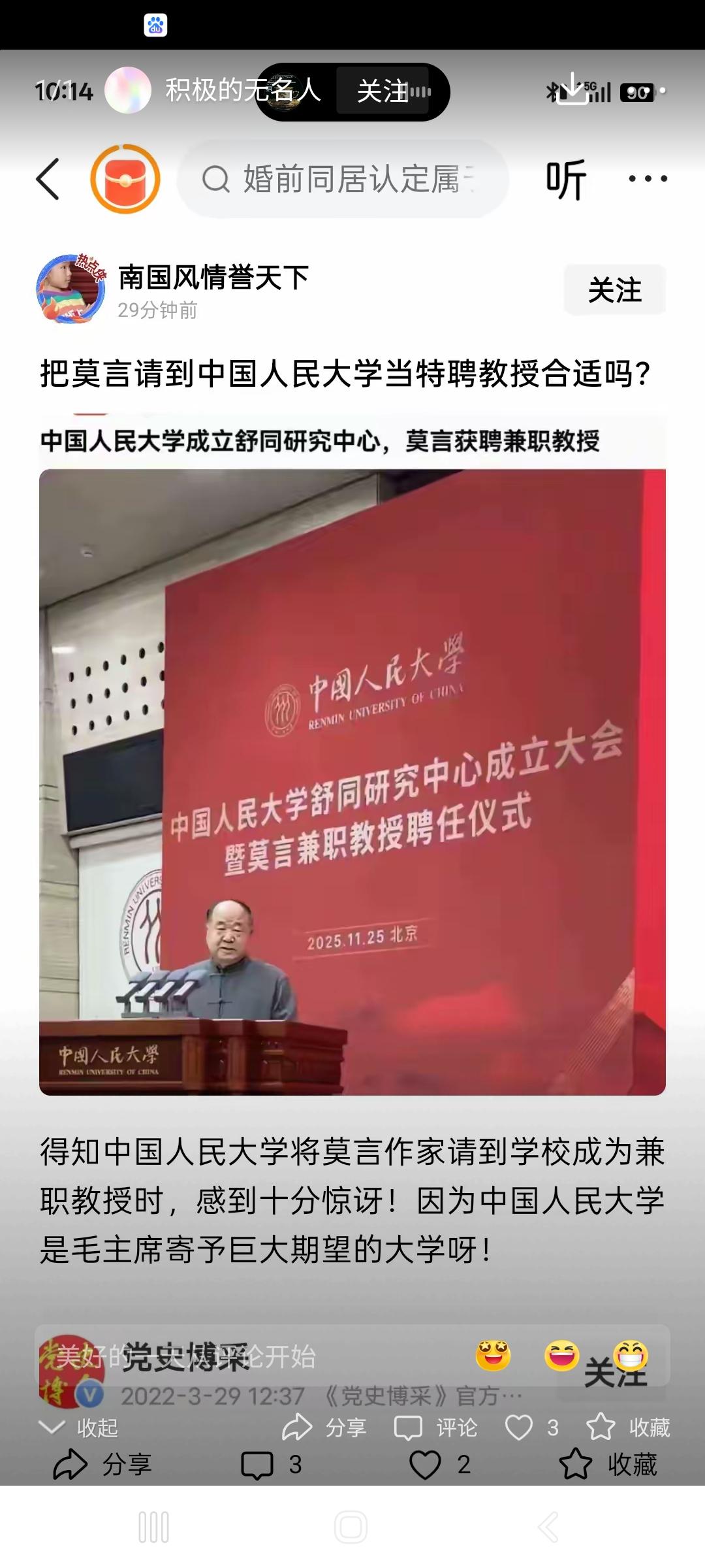 人民大学请莫言去工作,司马南后槽牙都咬碎了。 他不是干了三天就被学生轰走了吗?