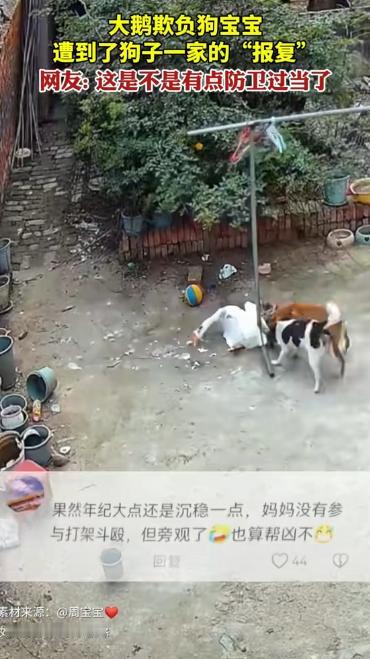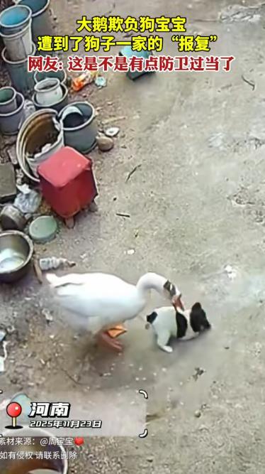 11月23日,河南一女子办完事回家,发现自家大鹅死了!她以为家里进了贼,结果查看监控后,却傻眼了,自家大鹅,竟然是被自家狗子咬死的,原来,大鹅在院子里霸凌小狗崽,遭狗崽一家报复活活咬死,主人:惋惜大鹅虽不无辜,但罪不至死! 河南的孙女士(化名),办完事回家一进院子就傻了眼,养了好几年的大鹅,平时一看见她回来就会扑棱着翅膀凑过来,今天却连个影子都没见着,院子里倒是到处散落着血迹,还有不少白色的羽毛,看着乱糟糟的。 孙女士心里突然紧了一下,又惊又怒,她第一反应是,难道有人闯进家里偷东西,还把大鹅给弄走了? 她急得在院子里转来转去,找了好半天都没找到大鹅,突然想起家门口装了监控,随即她赶紧拿出手机调出了当天的监控录像。 点开录像的那一刻,孙女士眼睛都看直了,怎么也不敢相信自己看到的画面,伤害大鹅的不是外人,竟然是自家的母狗和一窝刚生没多久的狗崽。 监控里清清楚楚地显示,事发的时候,大鹅像往常一样转悠,可没一会儿,它就朝着小狗狗的那边走去,对着那些刚出生没多久的小狗崽,又是抢食,又是用嘴巴顶挤,还追着狗崽跑,明显是在欺负这些小家伙。 狗妈妈一开始只是护在狗崽旁边,对着大鹅 “汪汪” 叫,像是在警告,可大鹅根本没当回事,还是一个劲儿地欺负狗崽。 这下母狗急了,直接冲上去对着大鹅咬了起来,几只狗崽也跟着围了上去,一起围攻大鹅,它们有的咬大鹅的腿,有的咬大鹅的翅膀,场面特别惨烈。 大鹅虽然也挣扎着反抗,可它一个 “人” 哪里打得过母狗和一群狗崽,没几分钟,大鹅就倒在地上不动了,地上慢慢渗出了血迹。 孙女士反复看着监控,心里又难受又无奈,她没想到,自己养的大鹅平时竟然这么凶,更没想到母狗和狗崽会做出这样的事,这简直就是动物之间以暴制暴的悲剧。 而狗这种动物,本来就有群体协作和保护幼崽的本能,看到自己的孩子被欺负,肯定会不顾一切地反击,有时候就容易造成严重的伤害。 说到底,问题还是出在人的管理上,要是孙女士之前能给院子里弄上合理的围栏,把家禽和狗分开养,或者平时多看着点它们,可能就不会发生这样的事了,那些弱小的动物也不会成为被欺负或者报复的对象。 后来孙女士在村里跟大家一起讨论,想办法避免以后再出现这种情况,大家你一言我一语,提出了不少有用的建议。 这事传到网上后,网友们也纷纷留言,大部分人都觉得可惜,还反思说动物之间本来就有弱肉强食的情况,可作为饲养它们的人,得负起管理的责任,不能不管不顾。 也有人说,大鹅挺可怜的,狗崽也挺可怜的,它们其实都只是在遵循自己的本能做事,错的不是它们。 不管怎么样现在说什么都晚了,大鹅已经没了,能做的就是从这件事里吸取教训,孙女士说,以后她会调整饲养的方式,尽量不让不同种类的动物在狭小的空间里待着,避免它们再发生冲突。 其实这只大鹅的悲剧,也给所有养动物的人提了个醒,喜欢动物、善待动物是好事,但光有爱心还不够,还得用理性的方法去管理和保护它们,这样才能避免更多没必要的伤害。 对此,你还有什么看法呢? (信息来源 :烟台融媒 )