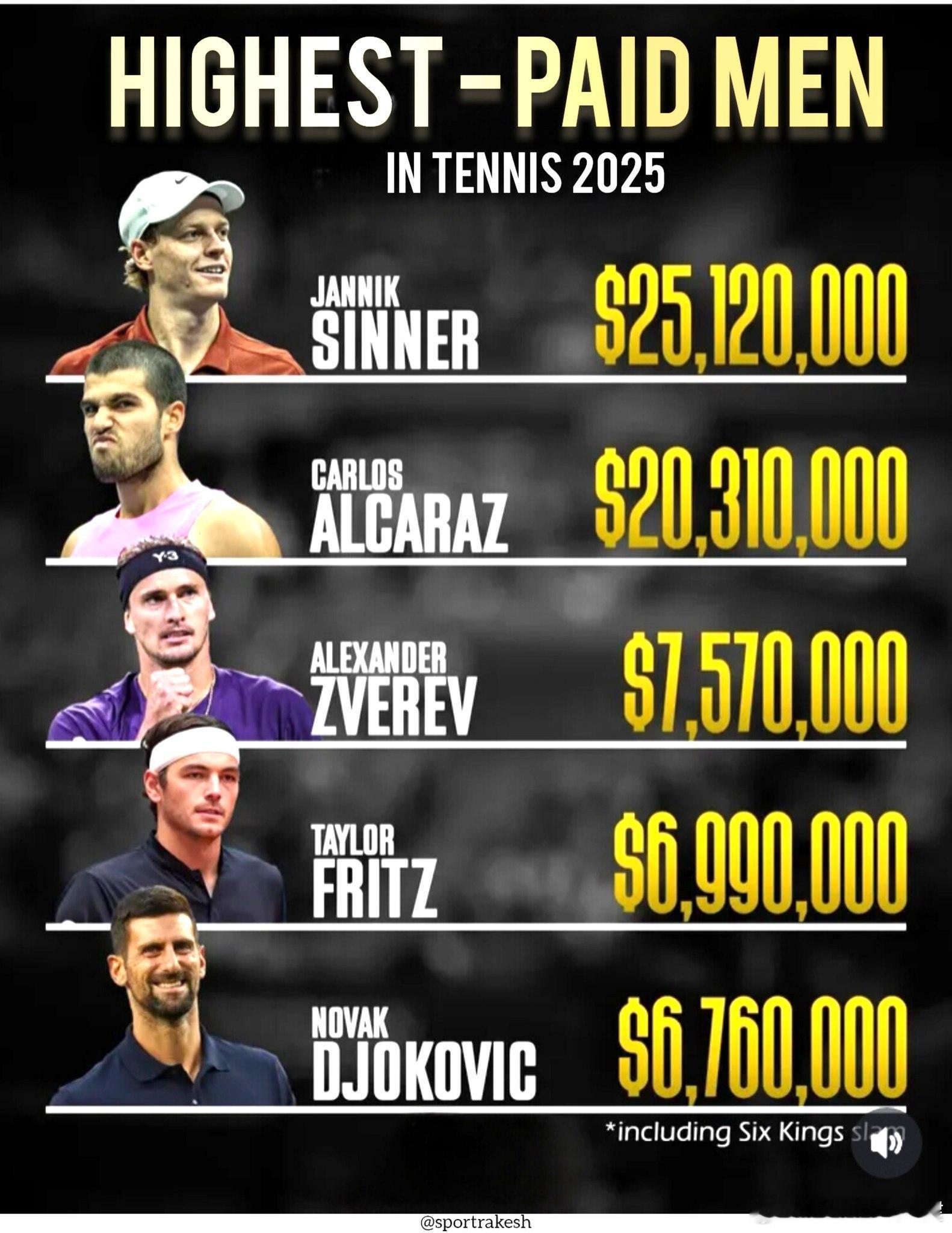 今年男网奖金TOP5(包括六王表演赛):1、辛纳 2512万美元2、阿尔卡拉斯 2031万美元3、兹维列夫 757万美元4、弗里茨 699万美元5、德约科维奇 676万美元热点现场