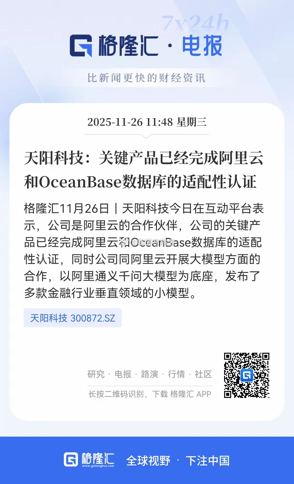 金融科技赛道突发利好!天阳科技绑定阿里云生态,金融垂直大模型落地突破午盘时段,金融科技领域传来重磅利好——天阳科技(300872.SZ)在互动平台披露的多项业务进展,彰显其在云生态适配与AI技术落地的双重突破,成为驱动公司估值重塑的核心催化剂。作为阿里云深度合作伙伴,天阳科技核心产品已完成阿里云平台及OceanBase分布式数据库的全面适配认证。这一技术突破不仅打通了与头部云厂商、核心数据库的兼容链路,更夯实了公司在金融IT领域的底层技术支撑能力,为产品切入阿里云生态内海量金融客户体系扫清了关键障碍。更值得关注的是,双方在AI大模型领域的协同进入实质性落地阶段。天阳科技以阿里通义千问通用大模型为技术底座,针对性研发并推出多款金融行业垂直小模型,精准匹配银行、证券等金融机构的场景化需求。例如在智能风控场景中,可实现风险信号的实时识别与预警;在投研辅助领域,能高效处理海量金融数据并生成分析报告,既借助通用大模型的技术积淀降低研发成本,又通过行业定制化开发构建差异化竞争壁垒。从产业逻辑来看,此次技术适配与大模型合作是天阳科技战略升级的关键落子:一方面,深度绑定阿里云生态,借助头部厂商的渠道资源与技术背书,快速拓展金融科技高价值客户;另一方面,通过垂直小模型的落地,推动公司从传统IT系统服务商向“技术底座+场景解决方案”的综合服务商转型,在金融数字化转型加速的浪潮中,抢占金融AI赛道的先发优势,长期成长空间有望持续打开。