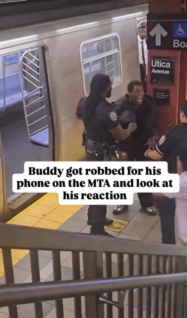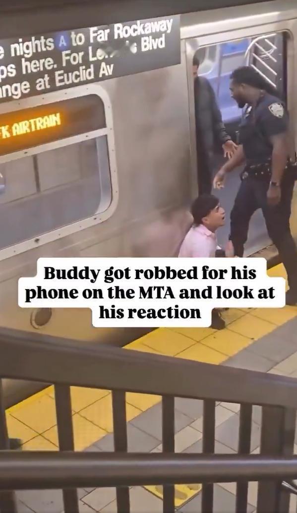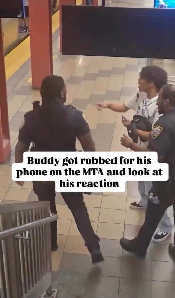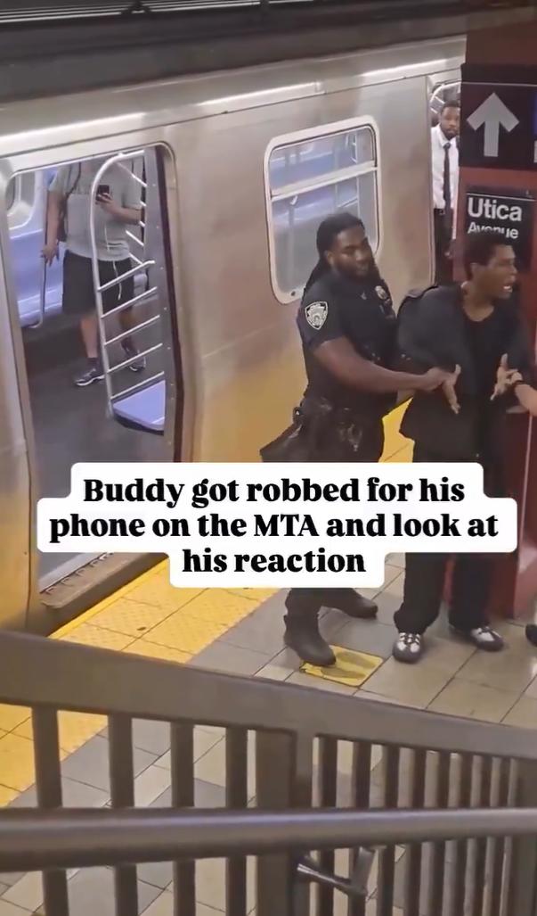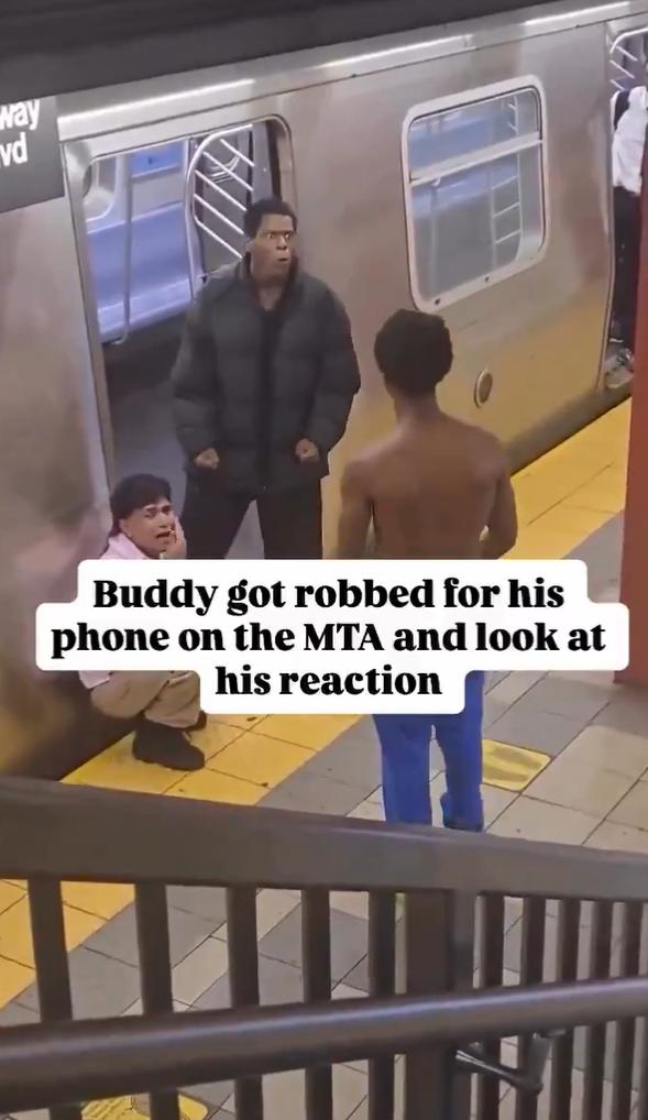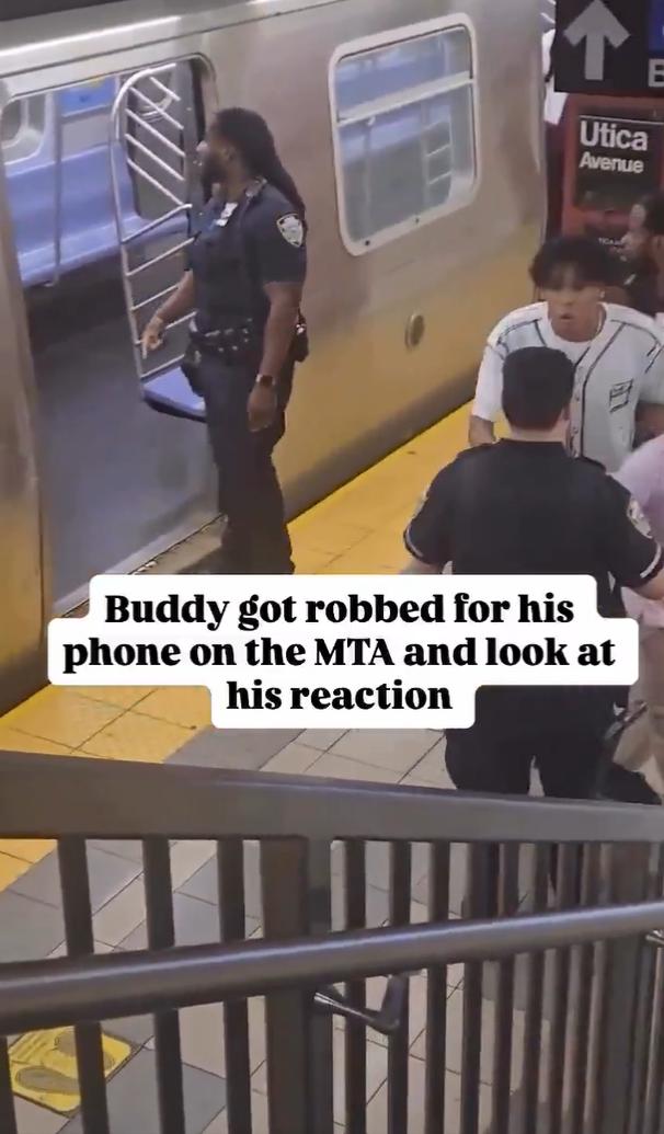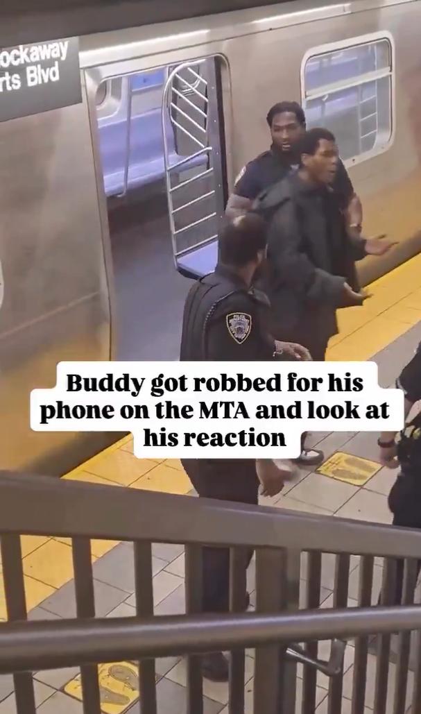 2025 年 8 月的视频,在纽约地铁开往远洛克威半岛的列车停靠某站,视频中一名劫匪抢走了一名男子的手机,但受害者的大声哭喊,让劫匪感到困惑,最终归还了手机,最终直到警察赶来逮捕那劫匪。