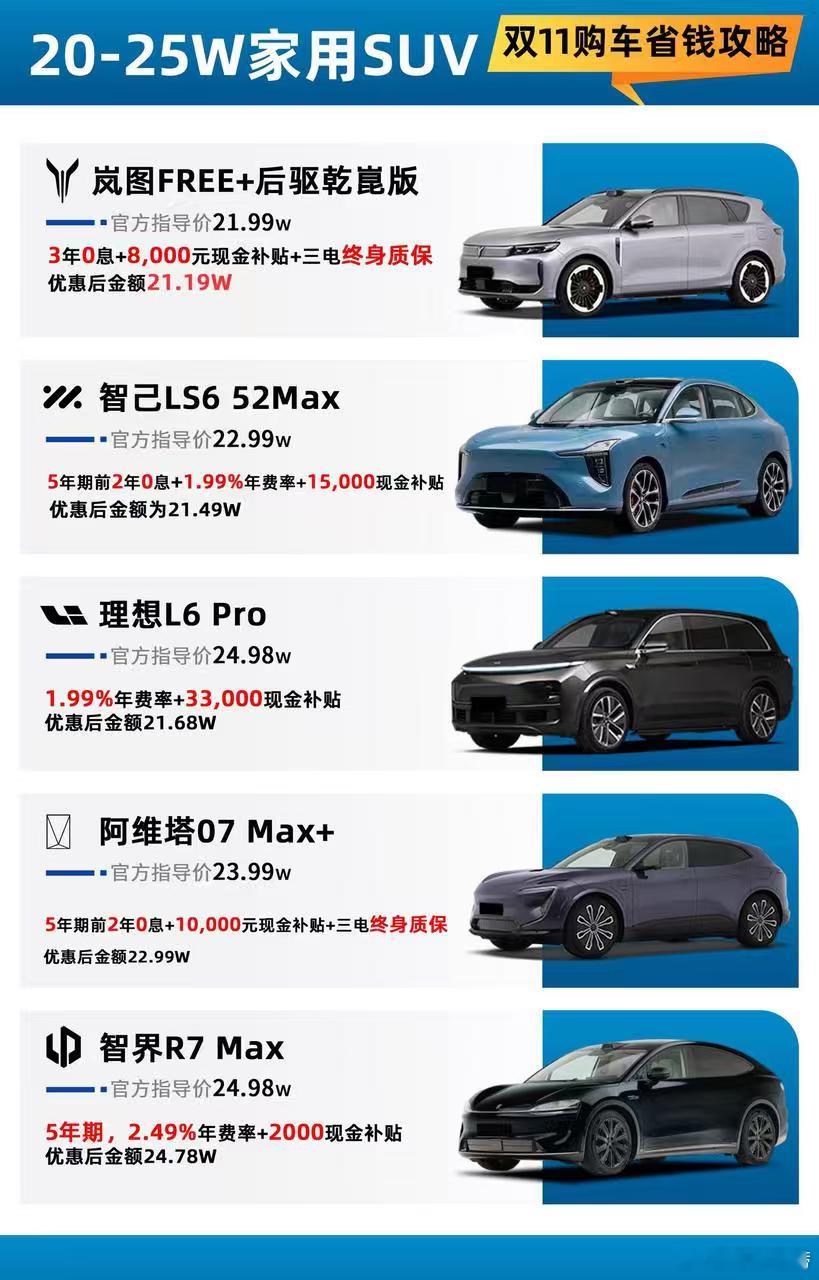 最全十一月省钱攻略!现在看还来得及 20-25W 家用 SUV 双 11 抄底价!11 月政策最后一周倒计时,就等你来!首先当然是25万级华系销冠必须先冲:官价 21.99W的岚图FREE+后驱乾崑,叠加3年0息和8000元现金补贴以及三电终身质保,优惠后仅21.19W!而且供车压力更小!销冠实力家用闭眼入不踩雷!其他热门款同样诚意拉满:智己LS6 52Max、理想L6 Pro均有大额补贴,追求性价比和家用空间党闭眼冲;阿维塔07 Max+、智界R7Max优惠也拉满,科技配置党与智能驾驶爱好者就等你来!岚图FREE+ 智己L6 理想L6 阿维塔07 智界R7