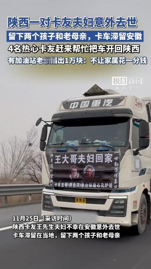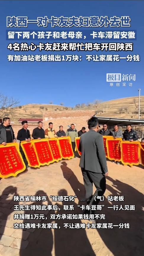 “令人揪心!”11月23日,陕西一对开货车的夫妻,在外地送货时,发生意外去世,留下2个孩子和80岁的老母亲,4名热心卡友得知后,驱车1300公里,自费将货车开回了陕西老家,更有热心人士捐赠10000元!网友:世上还是好人多。 很多人觉得货车司机挣钱非常多,所以也萌生了跑货车的念头,虽然报酬看似丰厚,但其中却有很多困难,先不说货车的驾驶证好不好考,送货途中一定要注意安全,毕竟这不仅影响交货时间,还和自己的生命相关。 前几天,王先生夫妇前往安徽送货,二人卸完货后,在检查车辆的时候发生了意外,两条年轻的生命就此陨落,家人得知后非常伤心,但两个儿子和老人都无法开车,连家人的遗体都无法接回来。 热心的卡友得知后,决定自费前往安徽,将二人和车子开回来,出发前,还有一位加油站的老板联系了几名卡友,愿意捐赠1万元,作为他们的路费,并表示如果还有剩余,就交给家属吧。 四人不分昼夜的奔波,路上轮流开车,最终跨越1300多公里,将货车开了回来,家人见到亲人的那一刻,瞬间哭成了泪人。 货车司机非常辛苦,他们成天在路上奔波,一年到头可能都休息不了几天,更别说回家陪家人了,而且路上还要打起十二分的精神,毕竟稍有不慎就可能出事故。 信息来源:《陕西卡友夫妇意外去世,留下两个孩子和老母亲,热心卡友远赴安徽帮其把车开回老家》极目新闻