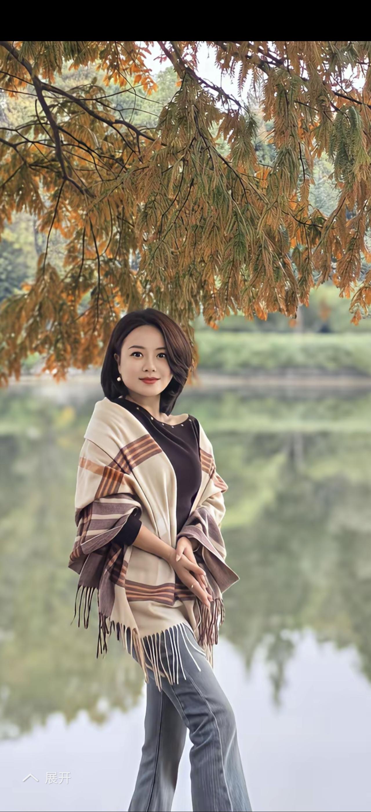 秋日暖阳下,格子围巾与棕色裙摆的完美搭配,尽显优雅与温暖。
