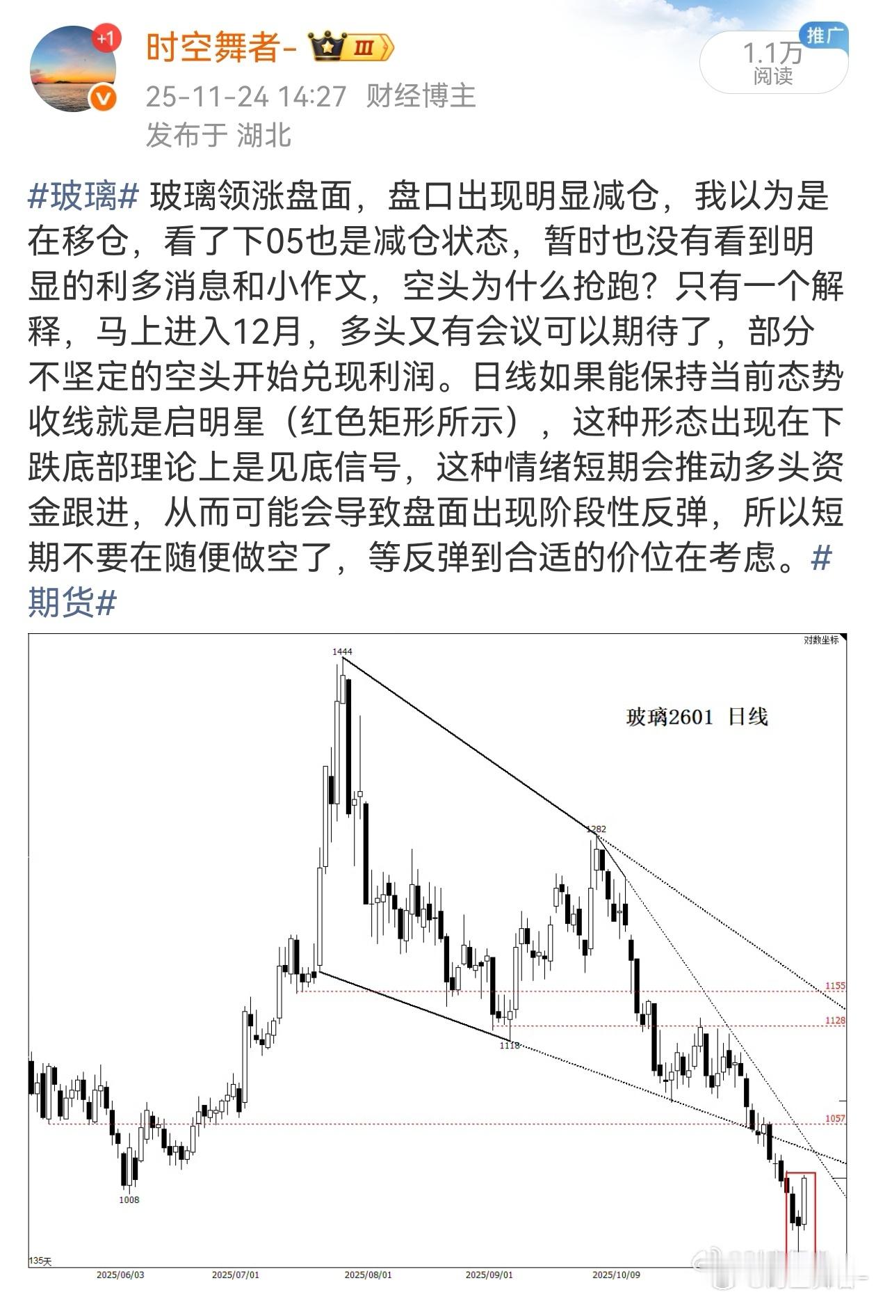 玻璃 技术面(日线级别低位启明星)+消息面配合(中玻临沂11.25终止厂库交割资格,),阶段性反弹基本确认,1010一线没有跌破前暂时偏多对待,但后续高空还是主思路,注意控制节奏。期货