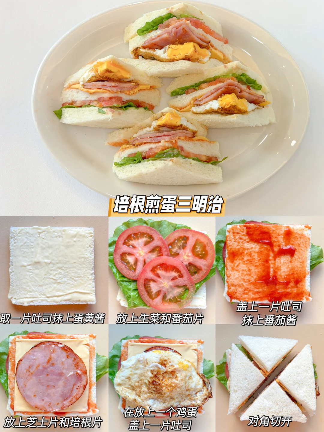 食材:培根、鸡蛋、吐司、生菜、番茄、芝士片、番茄酱